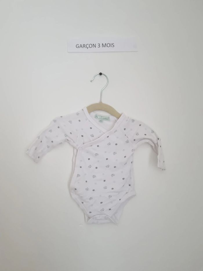 Body manche longues fermeture croisée à l'avant par boutons pression boutons pressions présent au niveau de l'entre-jambe body blanc avec motifs renard et empreintes de pattes portés plusieurs fois mais en très bon état mixte marque mes petits cailloux 3 mois 62 cm