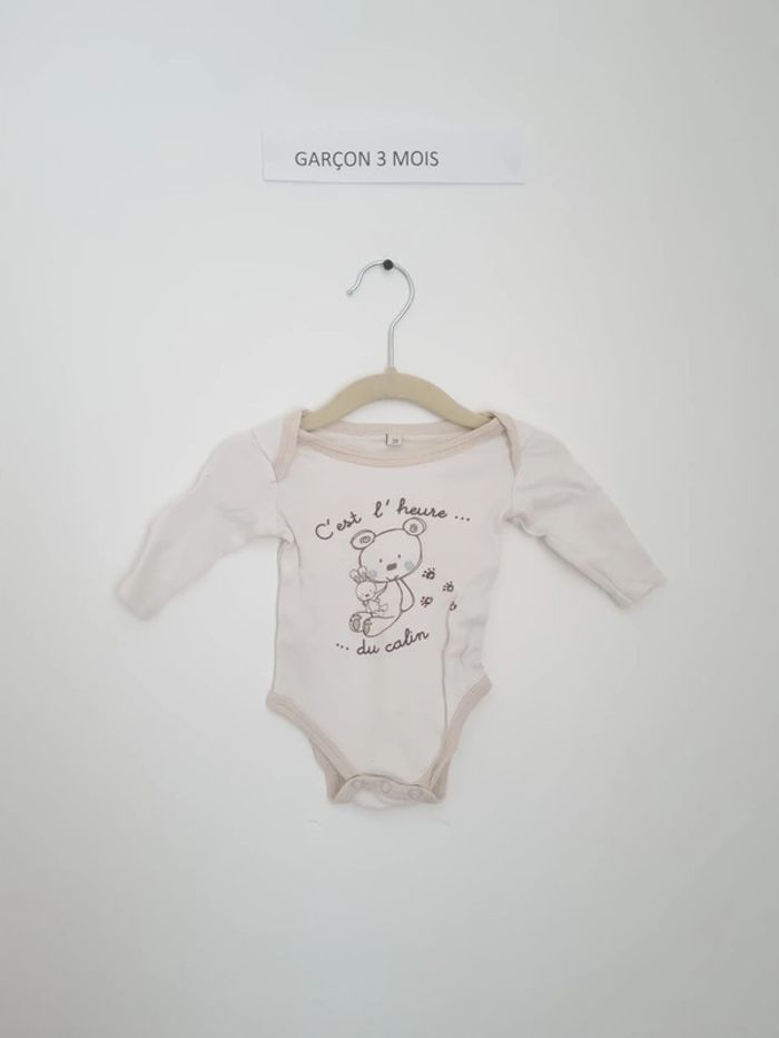 Body manche longues à enfiler par encolure américaine boutons pressions présent au niveau de l'entre-jambe body blanc crème avec petit ours marron, biais beige avec inscription "c'est l'heure du câlin " portés plusieurs fois mais en très bon état mixte 3 mois