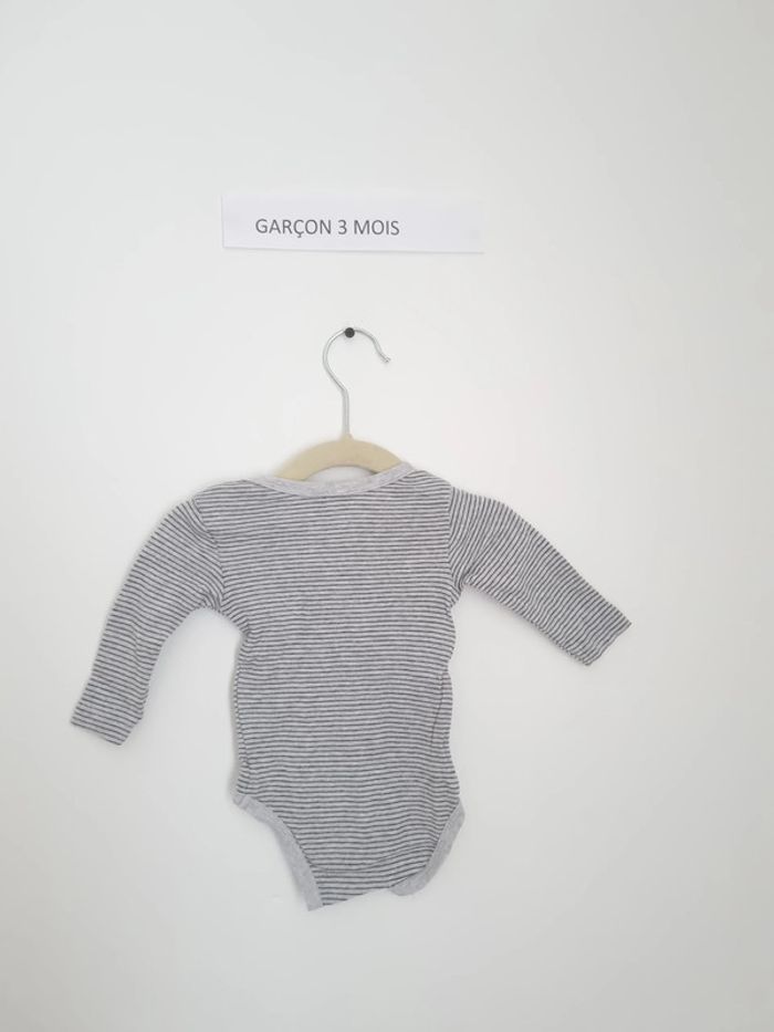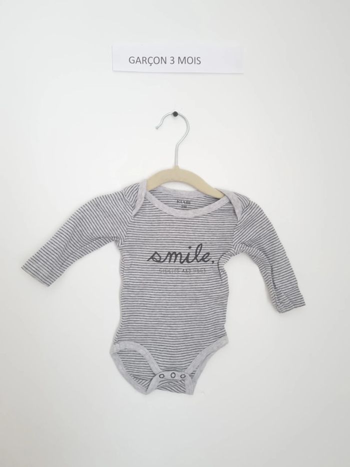 Body manche longues à enfiler par encolure américaine boutons pressions présent au niveau de l'entre-jambe body gris rayé noir avec inscription "smile, giggles and huggs" portés plusieurs fois mais en très bon état mixte marque kiabi 56-62cm 3 mois