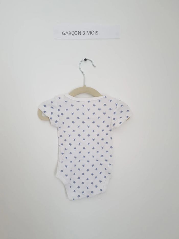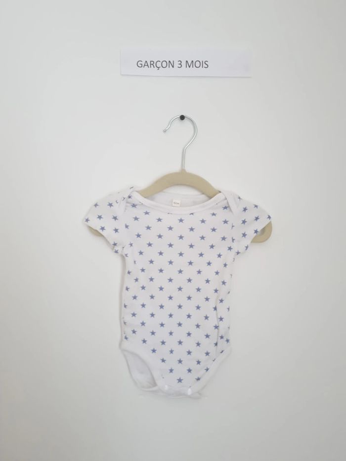 Body manche courtes à enfiler par encolure américaine boutons pressions présent au niveau de l'entre-jambe body blanc avec étoiles bleu portés plusieurs fois mais en très bon état mixte 62cm 3 mois