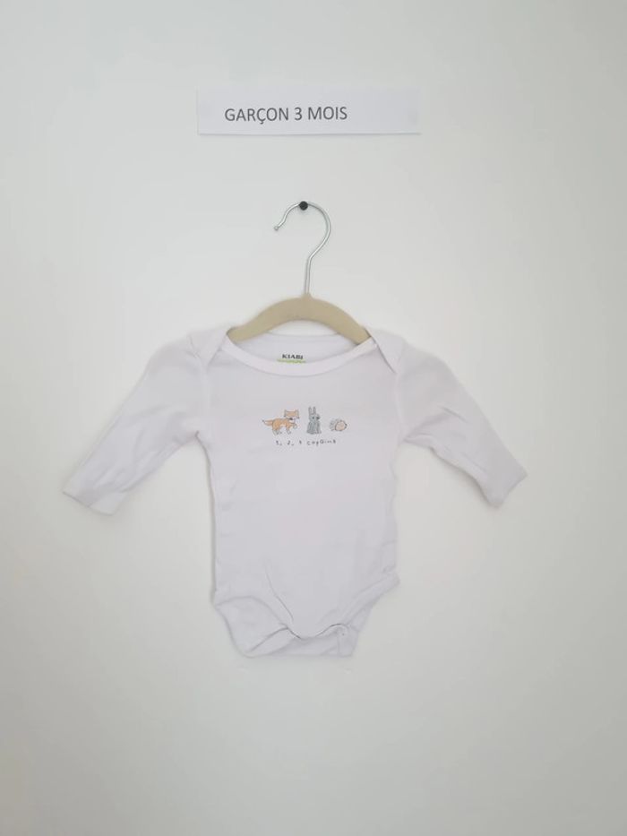 Body manche longues à enfiler par encolure américaine boutons pressions présent au niveau de l'entre-jambe body blanc avec petits animaux (renard , lapin et hérisson) avec inscription" 1.2.3 copains" portés plusieurs fois mais en très bon état mixte marque kiabi 56-62cm 3 mois