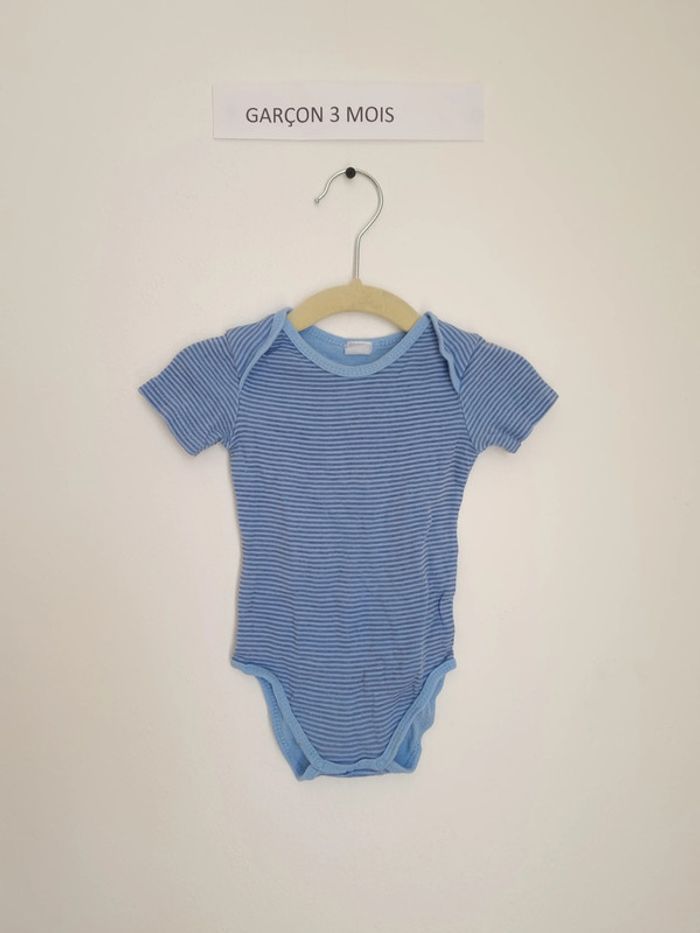 Body manche courte à enfiler par encolure américaine boutons pressions présent au niveau de l'entre-jambe bleu à rayure bleu foncé portés plusieurs fois en bon état mais une petite effilure au niveau d'un bouton pression (voir photo) n'entrave pas à son utilisation hors mis cela très bon état je le prends en compte dans le prix mixte 3 mois