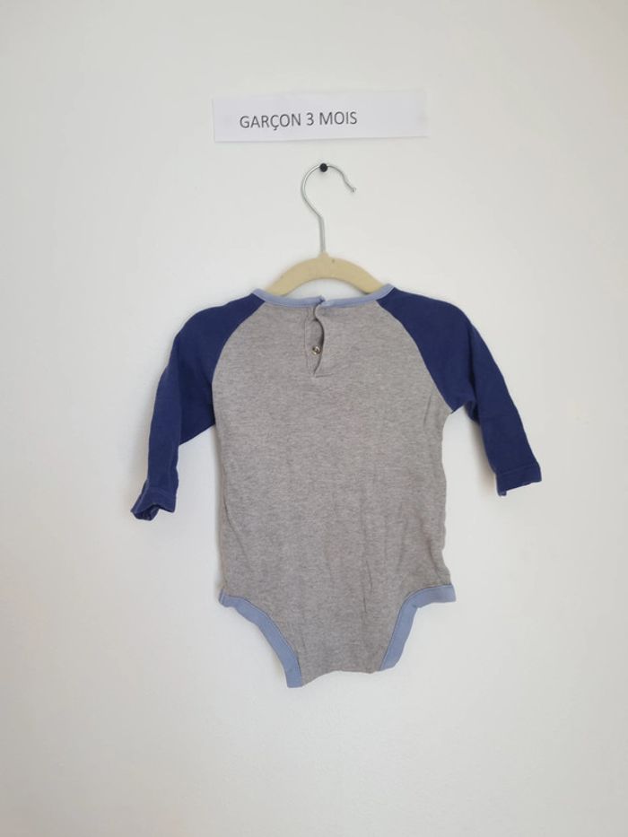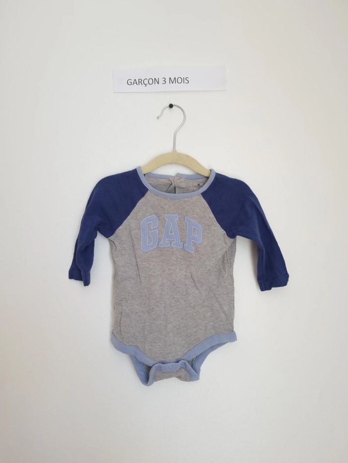 Body manche longue à enfiler par encolure américaine boutons pressions présent au niveau de l'entre-jambe gris avec les manches bleu marine inscription "GAP" en bleu clair portés plusieurs fois mais en très bon état mixte marque baby GAP 3-6 mois