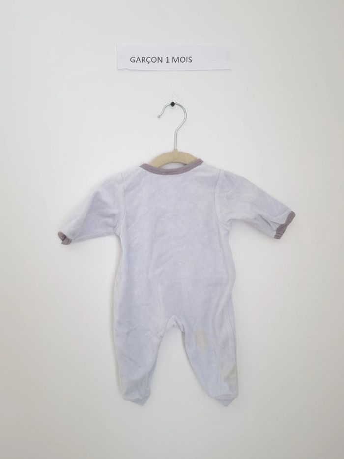 Pyjama 1 pièce chaud utilisé plusieurs fois mais en très bon état marque absorba taille 1Mois 54 cm fermeture par boutons pression sur l'avant sur 2 rangées allant vers chacun des pieds bleu clair avec biais gris-violet , petit ourson de dos avec inscription "avec tout mon amour mon doudou" mixte