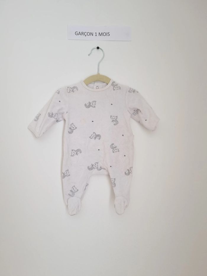 Pyjama 1 pièce chaud utilisé plusieurs fois mais en très bon état marque Kiabi taille 1Mois 52-55 cm 4 kilos fermeture par boutons pression sur l'arrière blanc avec petits paresseux gris mixte