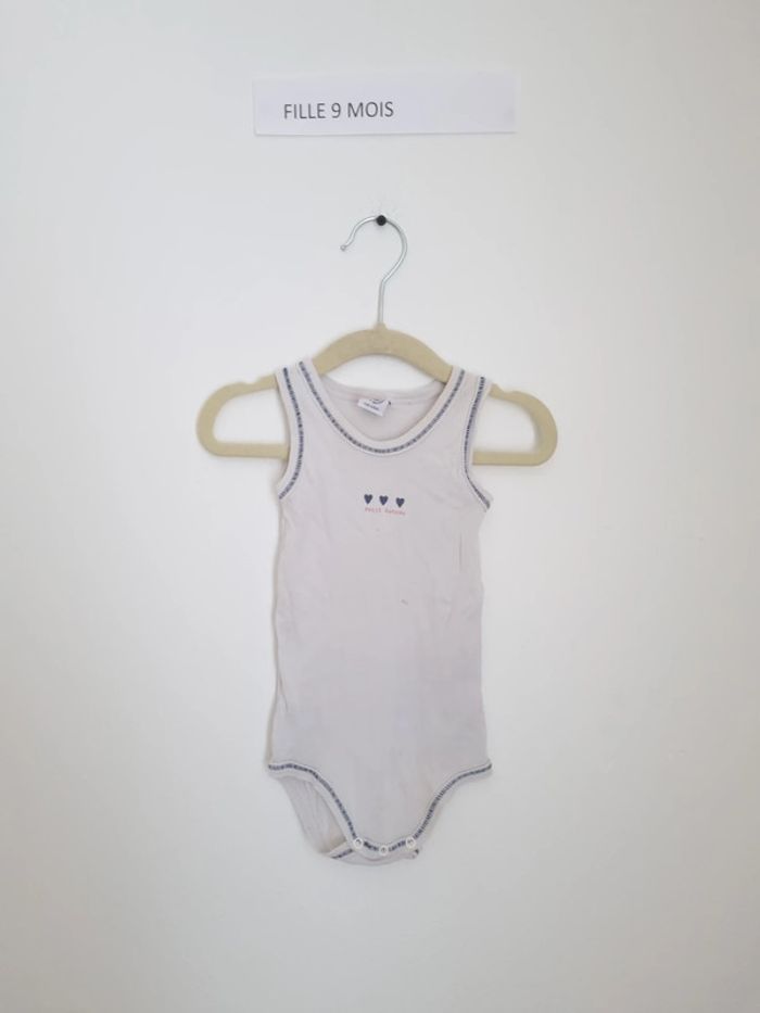 Body fille petit bateau à bretelles 9mois 71 cm blanc à enfiler bouton pression au niveau de l'entre-jambe à motifs petits cœurs bleu marine portés plusieurs fois mais en très bon état
