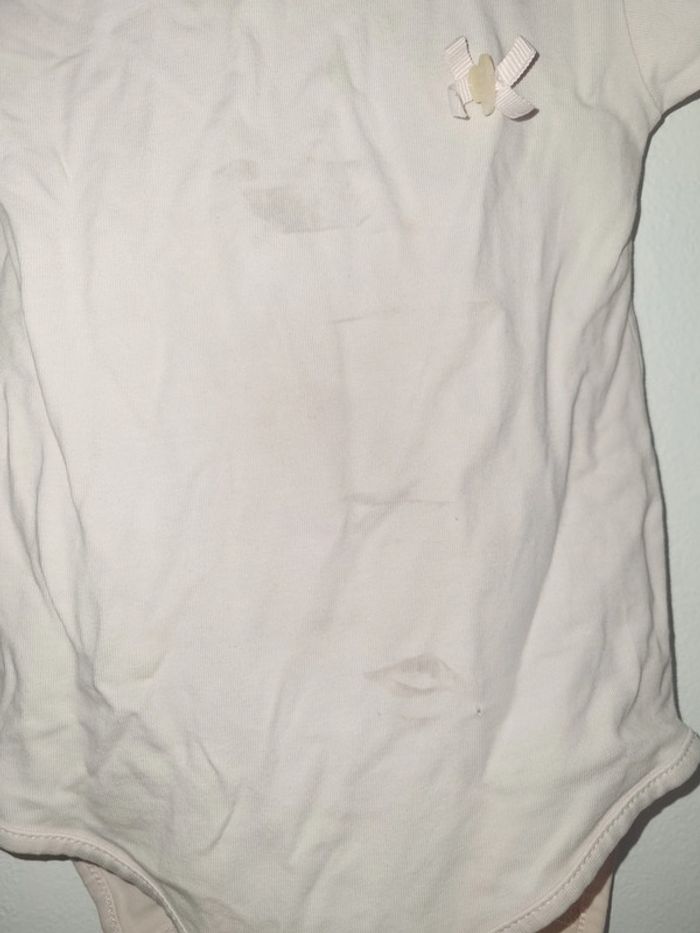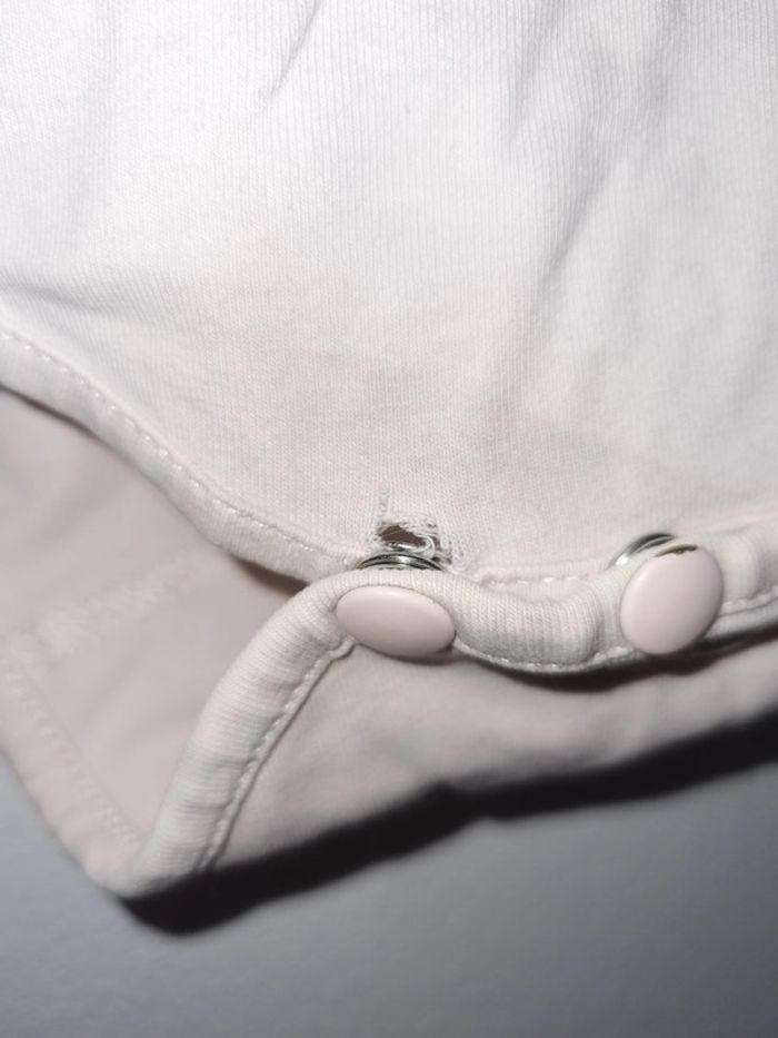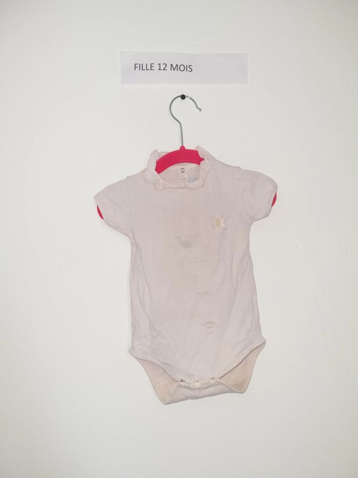 Body manche courtes tartine et chocolat 1 an fermeture à l'arrière par bouton pression jusqu'à mi- dos et au niveau de l'entre jambe de couleur blanche avec froufrous sur le col porté plusieurs fois et à des marque d'usure au niveau des boutons pression de l'entre-jambes, il y'a également une tache sur le devant, je relave toujours les vêtements avant envoi peut être que cela partiras mais je ne peux le garantir, dans le doute je le prends en compte pour réduire le prix.