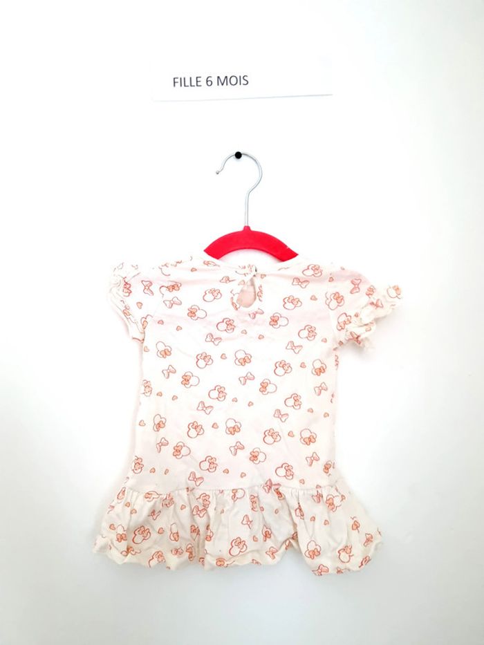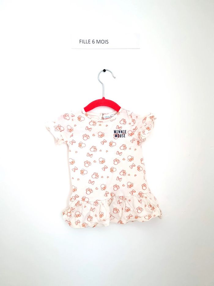 Robe courte à manche courtes couleur crème avec Minnie en rose/orange "vieux" (je n'arrive pas définir cette couleur) avec inscription "Minnie Mouse" à enfiler avec 1 bouton à pression sur l'arrière qui forme une petite ouverture dans le dos peu porté en très bon état