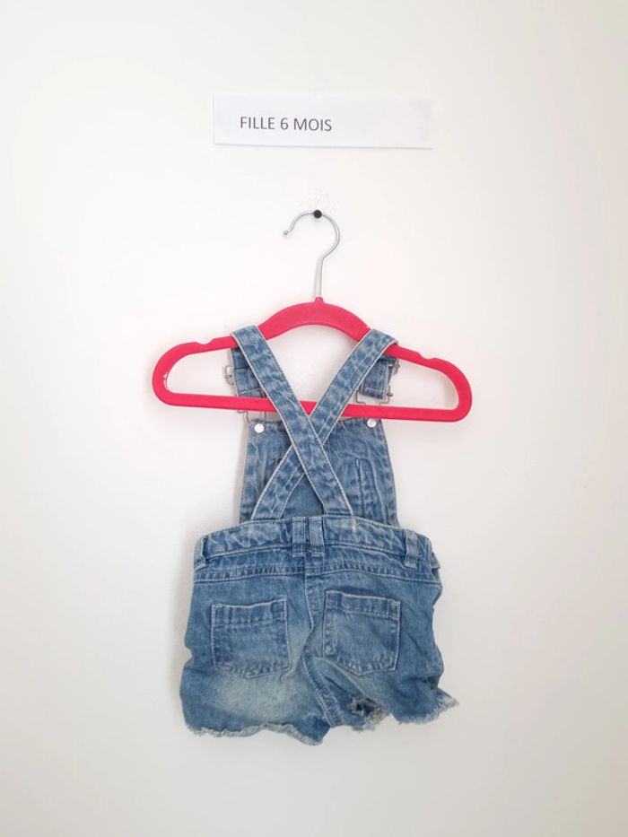 Short salopette en jean délavé attache à boucle croisé dans le dos boutons pressoir sur les côtés porté plusieurs fois mais en très bon état Baby by Gémo 6 mois