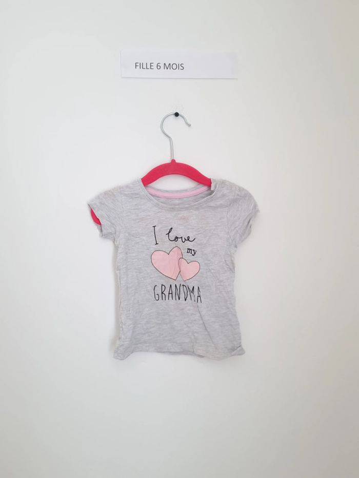T-shirt manche courte gris avec inscription "I love my grandma" (j'aime ma grand-mère / mamie) en noir avec 2 coeur roses porté 1 ou 2 fois très bon état primark 6/9 mois 74 cm