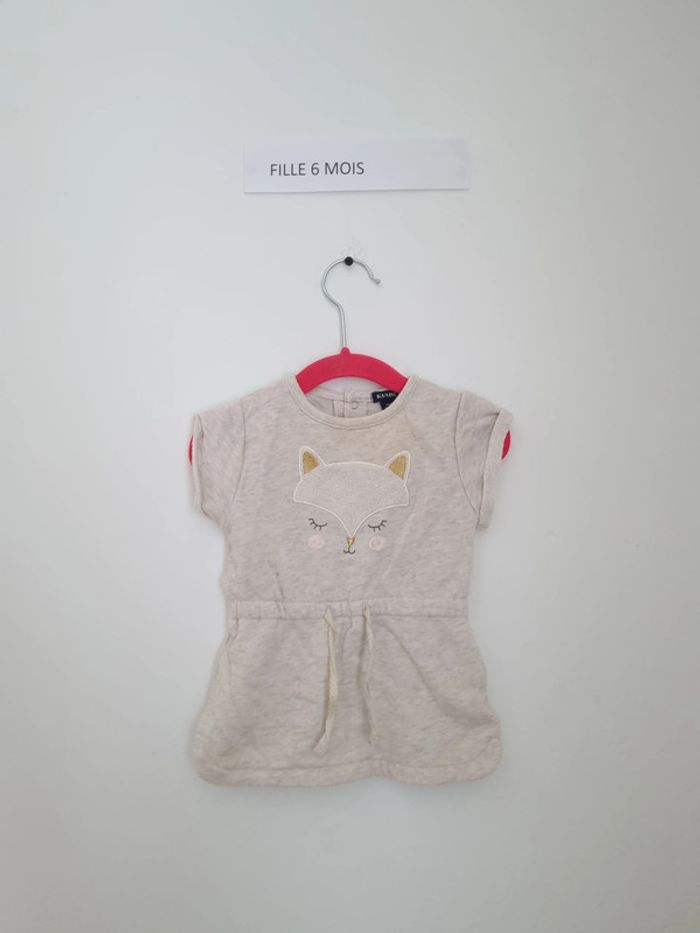 Robe courte ou haut long... épais couleur crème manche courte motif renard cordon de cintrage au niveau du nombril Fermeture à l'arrière par bouton pression jusqu'à mi dos kiabi 63-69cm 6 mois petite tache à l'arrière, entre les boutons pression, visible sur la photo mais rassurez vous je relave chaque vêtements avant envoi au cas où la tâche ne partirais je réduit le prix d'office