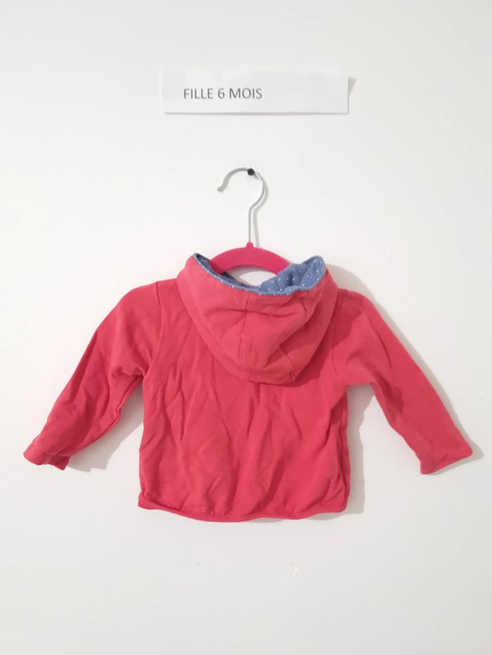 Veste fille rose fermeture par boutons pression sur le devant capuche et poche présente porté quelques fois en très bon état obaibi 6 mois 68 cm