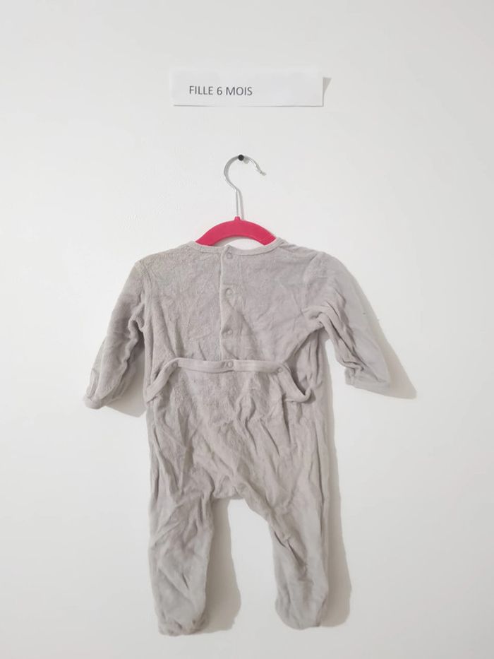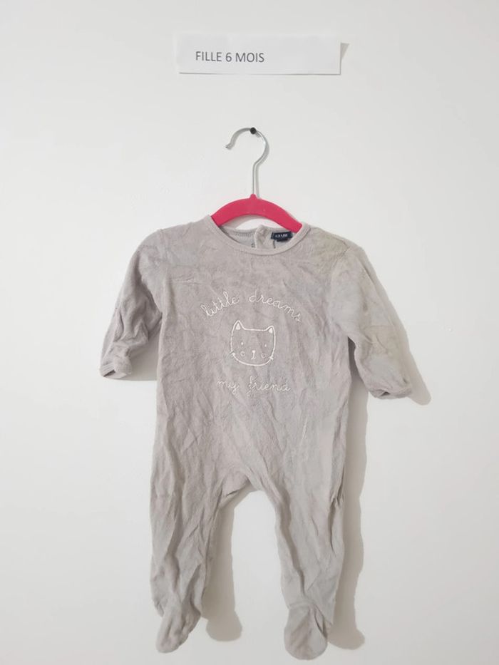 Pyjama 1 pièce mixte gris avec petit chaton blanc inscription "little dream my friend" ( petit rêves mon ami) fermeture sur l'arrière par boutons pression portés plusieurs fois mais en bon état marque kiabi 6 mois 62-69 cm 8 kilos