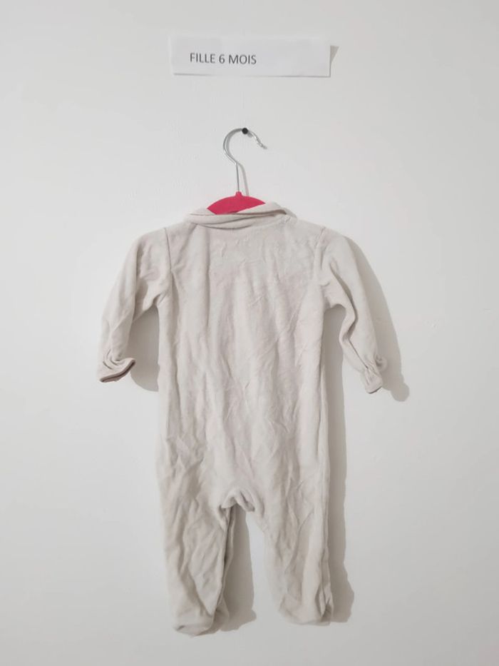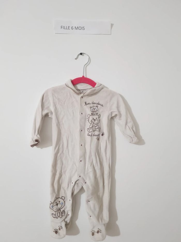 Pyjama 1 pièce mixte de la marque kimbaloo 6 mois porté plusieurs fois mais toujours en bon état fermeture par l'avant par bouton pression il y en a aussi au niveau de l'entre jambe couleur crème avec motif petit ourson inscription "mon doudou"