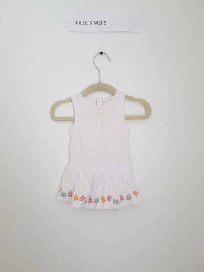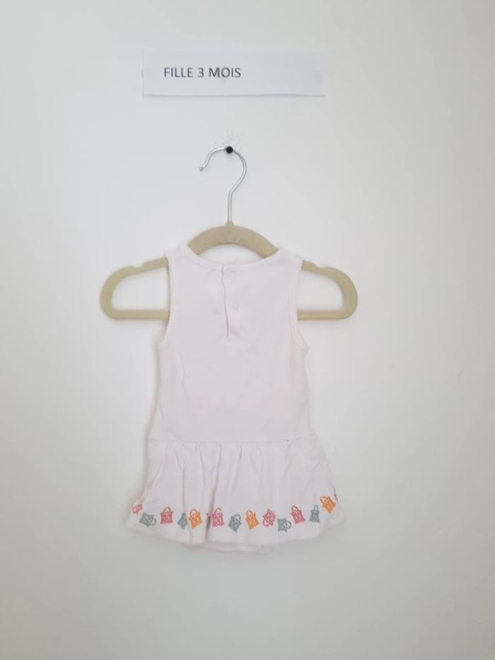 Body avec petite jupette motif tortues brodées uni blanc bouton pression derrière jusqu'à la mi- dos puis au niveau de l'entre-jambes très peu porté très bon état 3 mois 60 cm