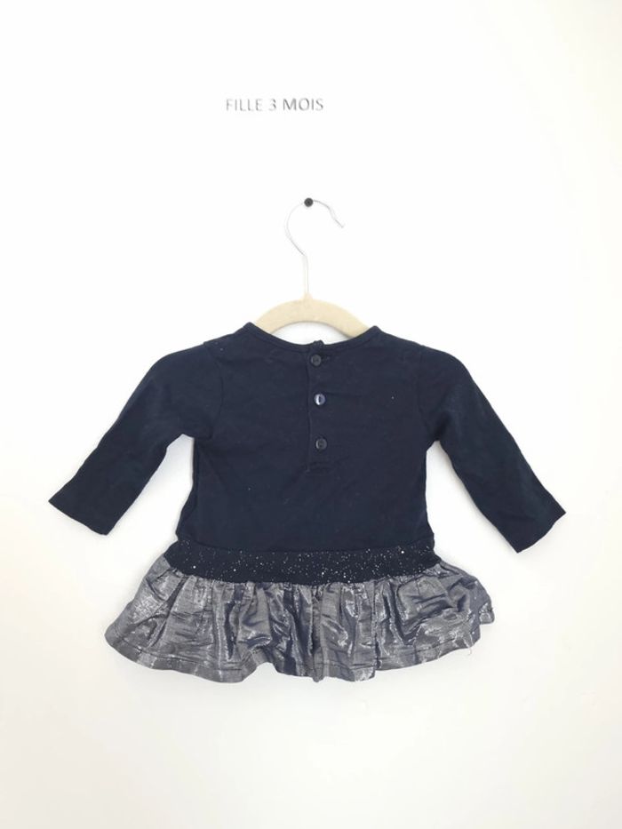 Robe de couleur bleu marine avec jupette argenté motif étoile en sequins à enfiler avec boutons à l'arrière jusqu'à mi dos portes quelques fois mais en très bon état taille 3 mois