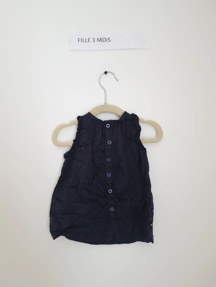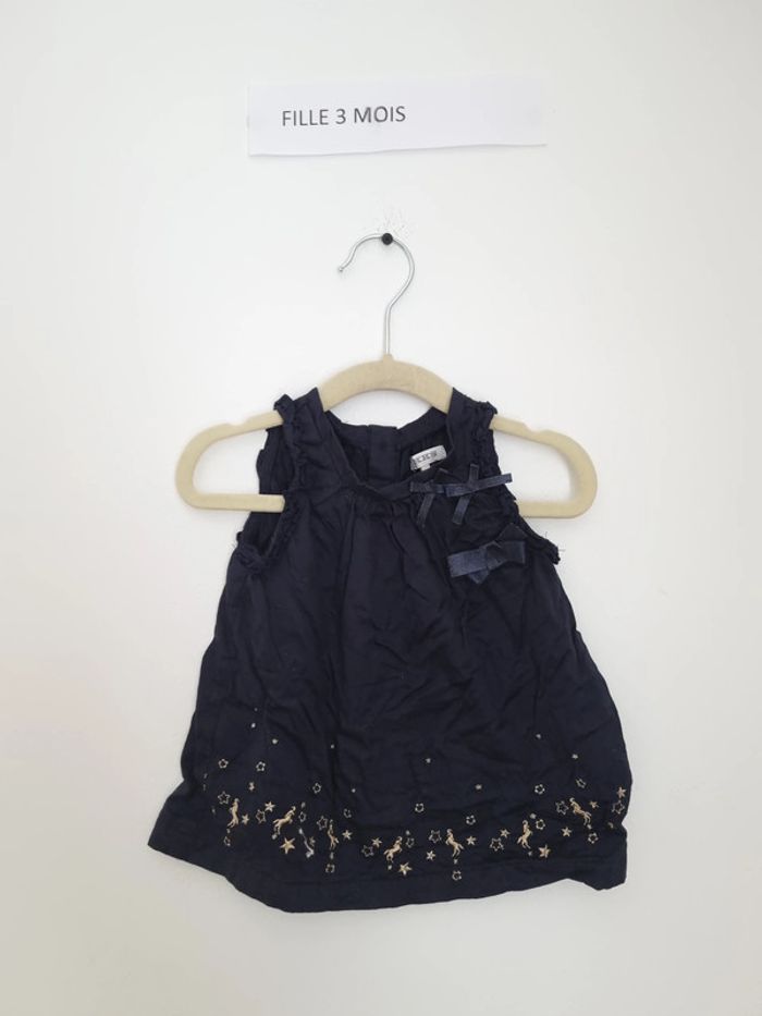 Robe de la marque IKKS 3 mois 60 cm portés plusieurs fois mais en très bon état de couleur bleu nuit avec étoiles et licornes brodée en doré sur le bas fermeture par bouton pression à l'arrière de la robe