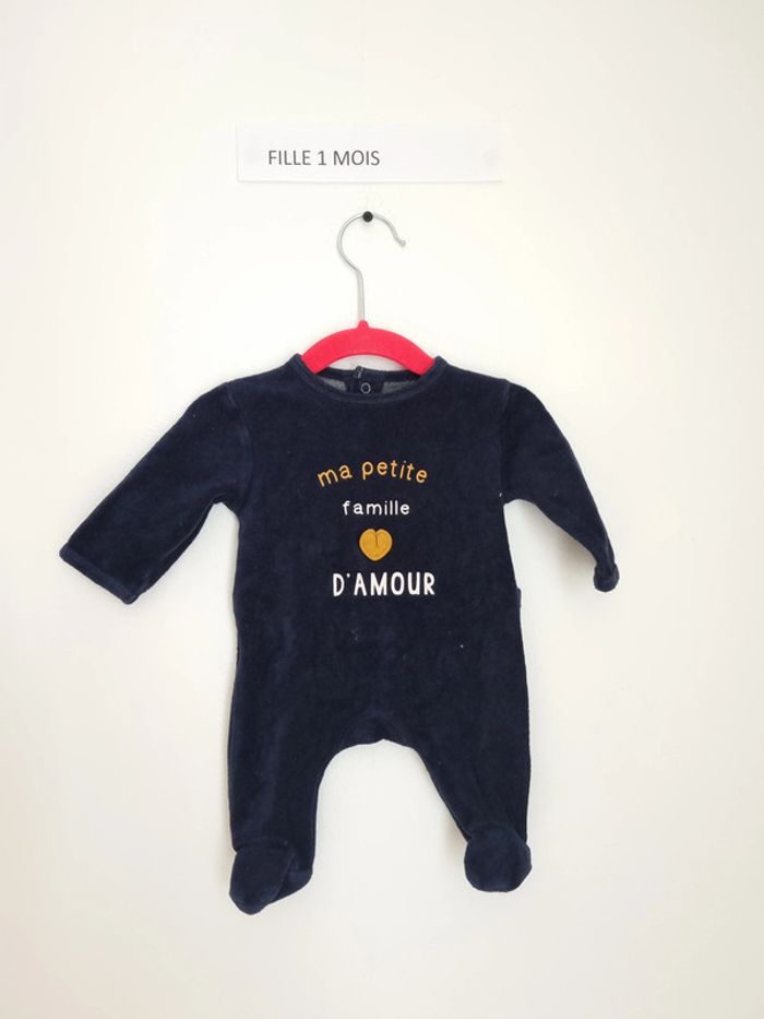 Pyjama velours fille mais peut être mixte "ma petite famille d'amour" de couleur bleu marine avec un petit cœur moutarde fermeture sur l'arrière par boutons pressoir