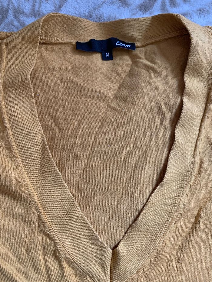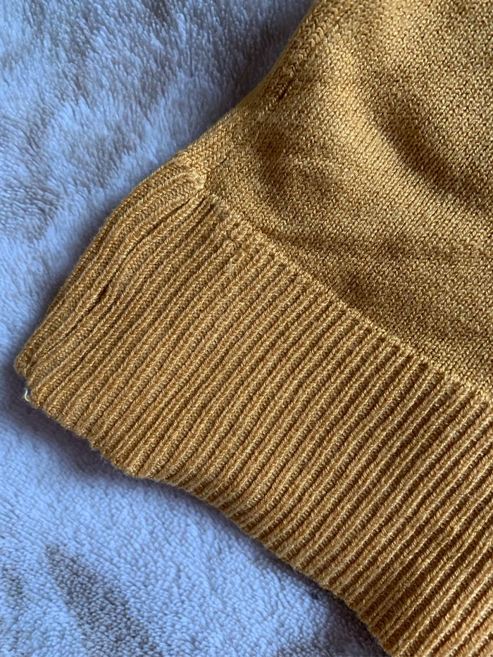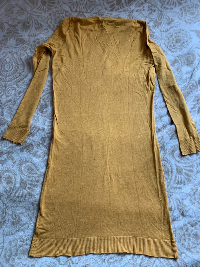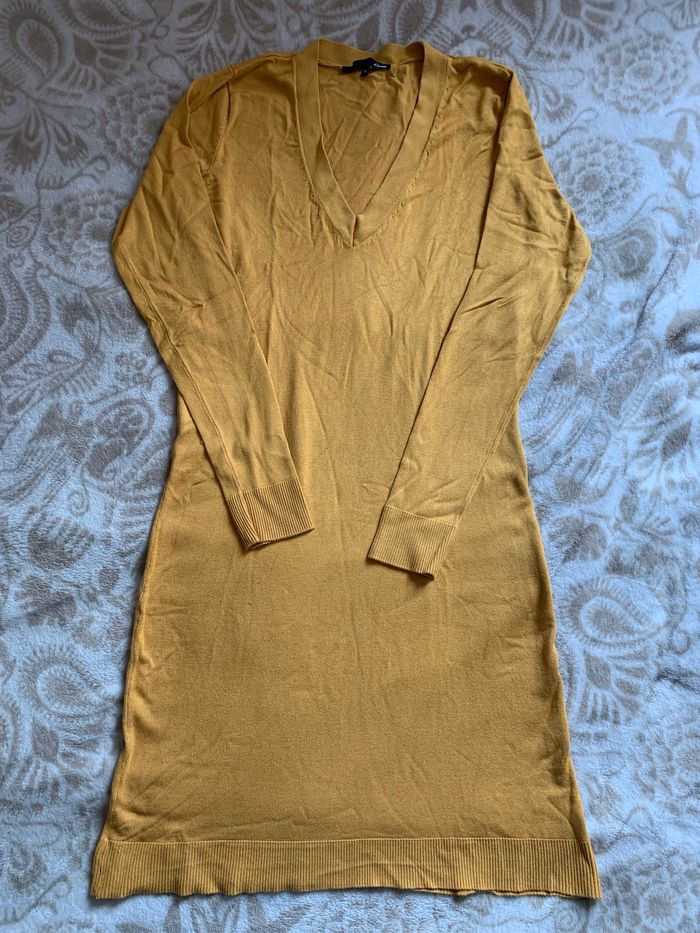 Robe pull manches longues, longueur 88 cm, couleur moutarde. Peu portée, elle est un peu froissée car tassée dans mon placard et je ne repasse pas. Vraie couleur visible sur la dernière photo.