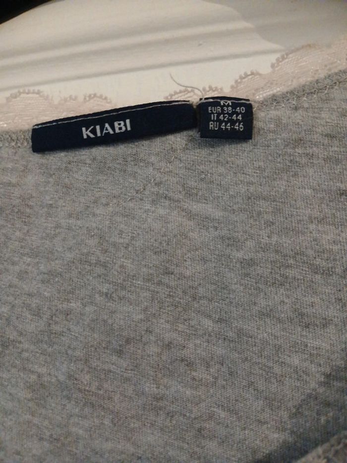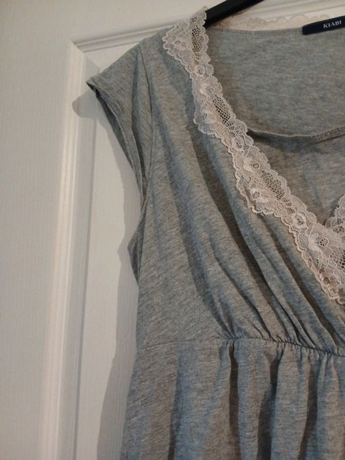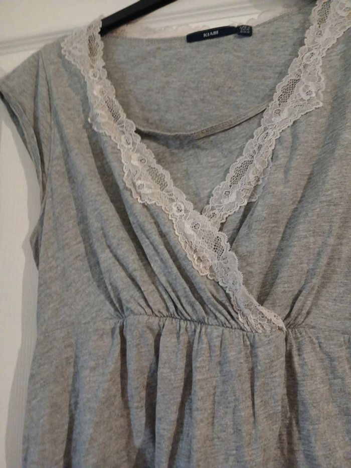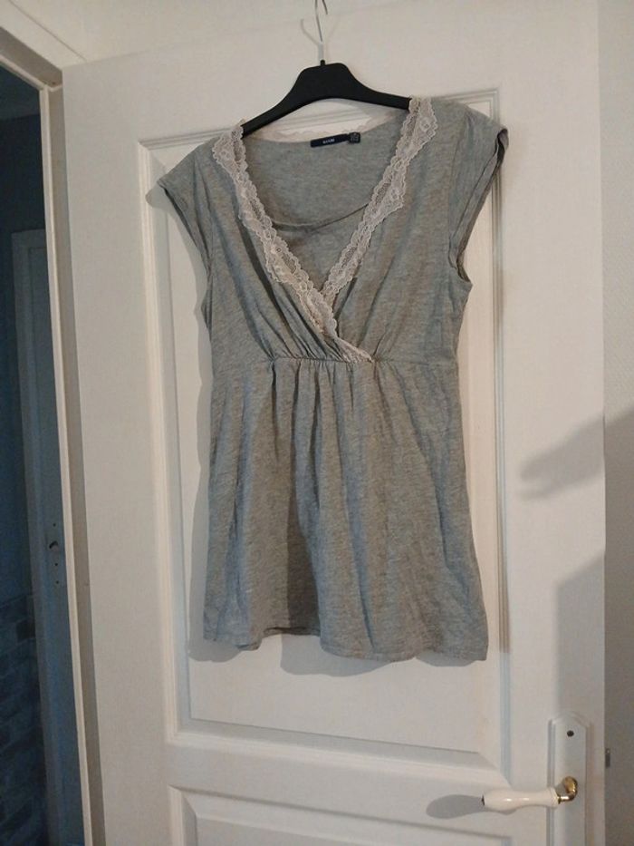 Blouse grise claire avec dentelle ( qui a un peu changé de couleur)autour de l’encolure ,petites manches.Un peu froncé à la taille sur le devant et le dos, peut-être porter en début d’une grossesse. Bon état. Taille M . Eur 38/40. Kiabi