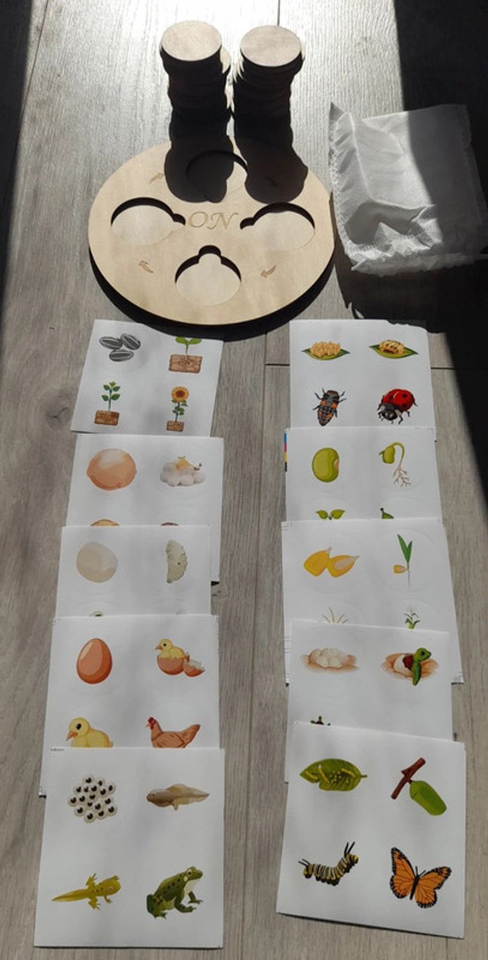 Ensemble de cycle de vie avec plateau en bois. Le lot comprend 40 rond en bois environ 4.5cm 10 planches de gommettes (4 par cycle de vie) 1 plateau en bois environ 18 cm 1 sac pour ranger les ronds Le jeu n à pas été utilisé #montessori #montessoriathome #montessoritoys #jeuxeducatifs #jeuxeducatifinspirémontessori #educationaltoys #jouets #maternelle #primaire #écolealamaison #ief #jouetbois
