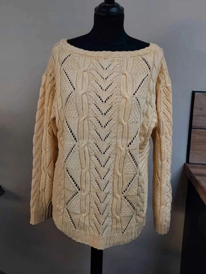 Pas d'étiquette de taille ni de composition mais convient pour une taille L Largeur aisselle à aisselle 56 cm Réductions possibles sur lot sur demande #pullhiverjaunefemme