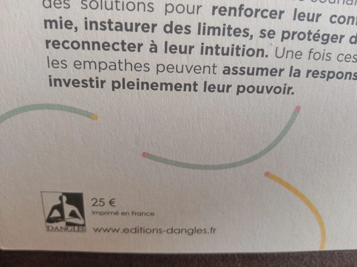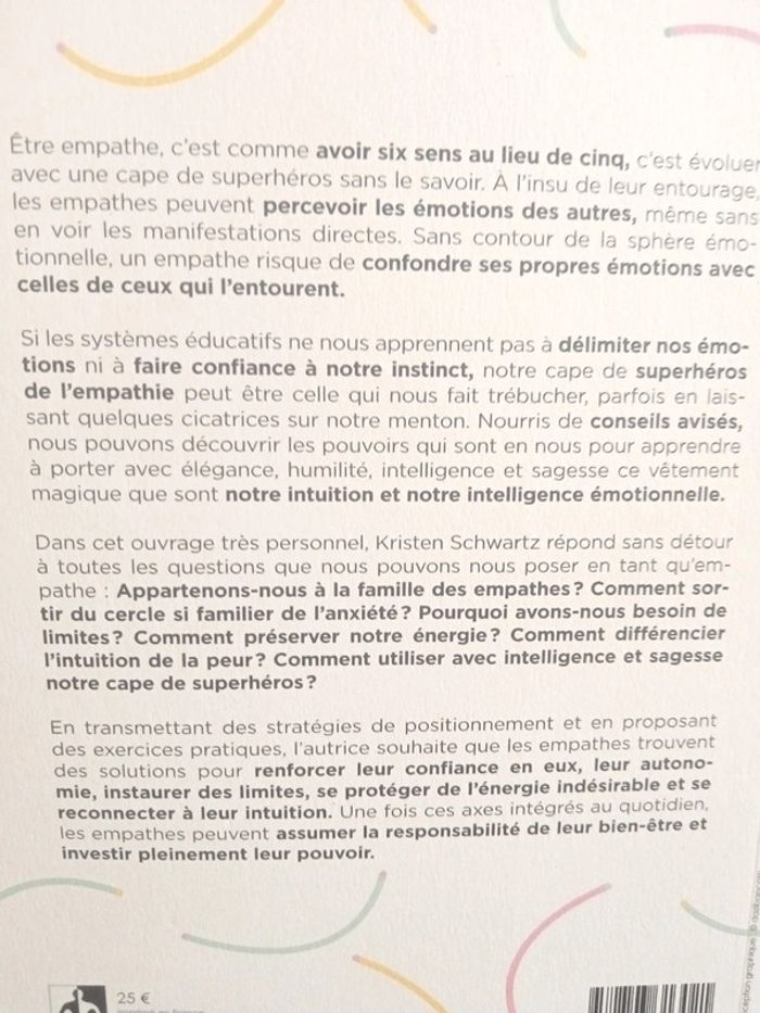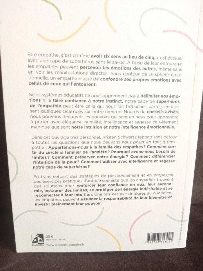 L'empathie, un héros malgré lui Dépasser sa sensibilité pour investir le pouvoir de son intuition Kristen SCHWARTZ Éditions D'angles (2023) 208 pages Neuf Être empathe, c’est comme avoir six sens au lieu de cinq, c’est évoluer avec une cape de superhéros sans le savoir. À l’insu de leur entourage, les empathes peuvent percevoir les émotions des autres, même sans en voir les manifestations directes. Sans contour de la sphère émotionnelle, un empathe risque de confondre ses propres émotions avec celles de ceux qui l’entourent. Dans cet ouvrage très personnel, Kristen Scwhartz répond sans détour à toutes les questions que nous pouvons nous poser en tant qu’empathe : Appartenons-nous à la famille des empathes?? Comment sortir du cercle si familier de l’anxiété?? Pourquoi avons-nous besoin de limites?? Comment préserver notre énergie?? Comment différencier l’intuition de la peur?? Comment utiliser avec intelligence et sagesse notre cape de superhéros ?? En transmettant des stratégies de positionnement et en proposant des exercices pratiques, l’autrice souhaite que les empathes trouvent des solutions pour renforcer leur confiance en eux, leur autonomie, instaurer des limites, se protéger de l’énergie indésirable et se reconnecter à leur intuition. Une fois ces axes intégrés au quotidien, les empathes peuvent assumer la responsabilité de leur bien-être et investir pleinement leur pouvoir. #lily2905jeuxjouetslivresbd #lily2905loisirsjeuxjouetslivresbd
