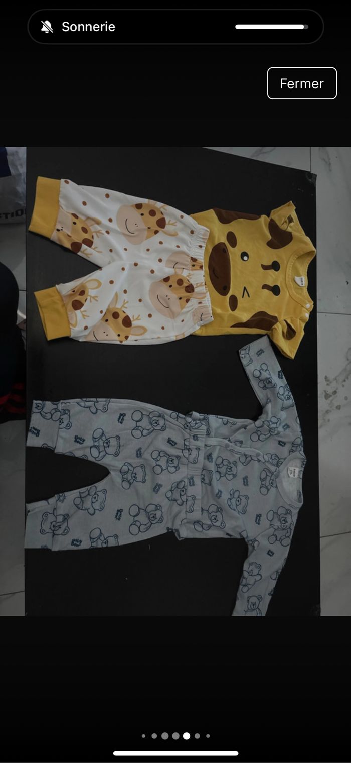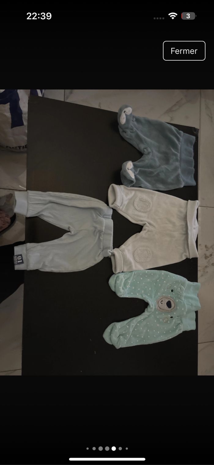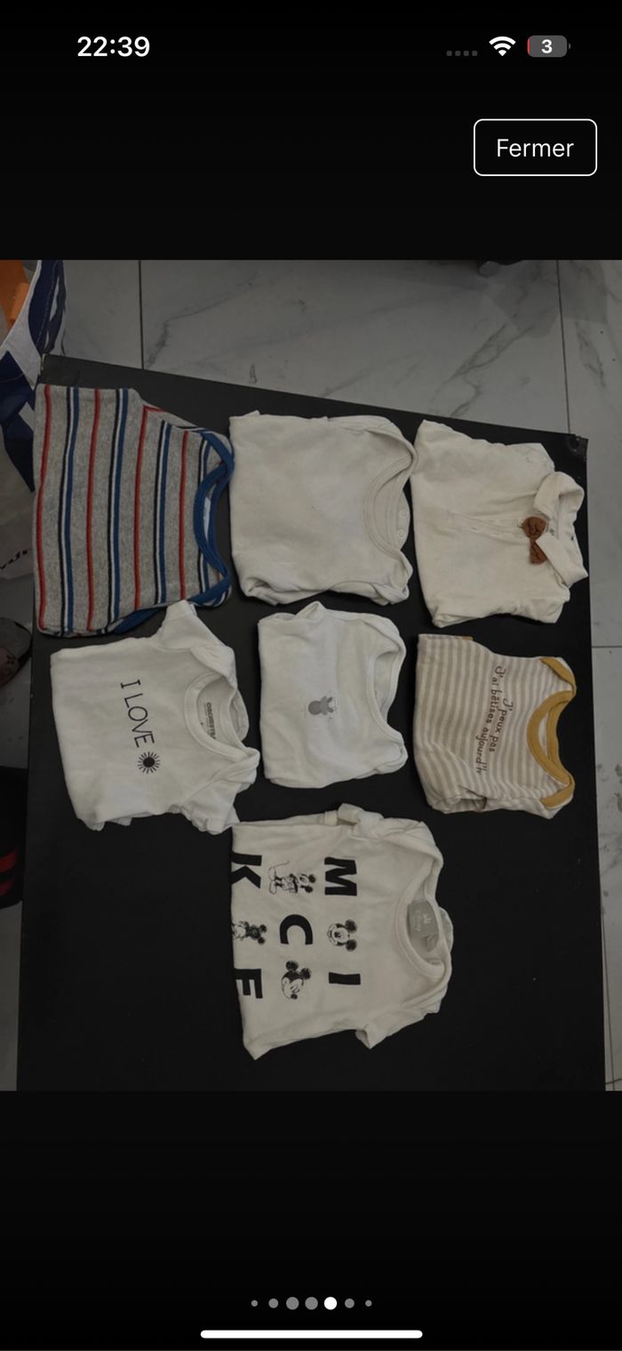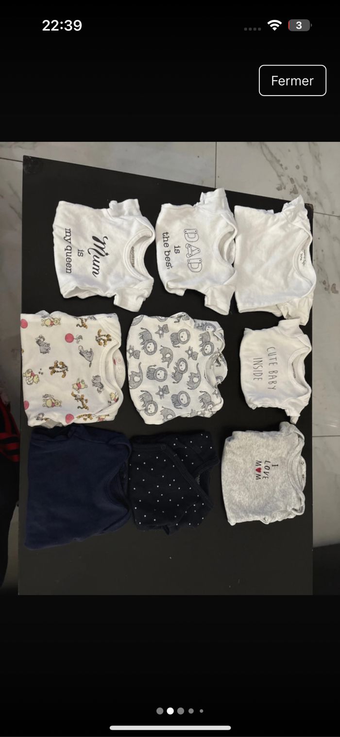 Lot 1 mois 25 pyjamas 16 bodys (6 manches courte et 10 manches longue) 7 bas de pantalons 5ensembles ( les bonnet sont avec) 5 salopettes 7 blouses (6 manches longue et 1 manches courte) 6 pulls/gillets 5 bonnets Tout est en état proche du neuf car bébé as pas eu le temps de tout porter voir neuf! Prix légèrement négociable