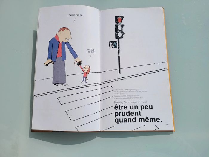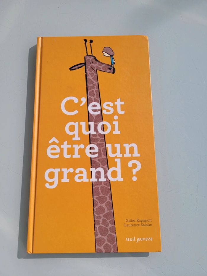 C'EST QUOI ÊTRE GRAND ? SEUIL JEUNESSE Partons à la découverte du « Grand ». En trente définitions, Laurence Salaün et Gilles Rapaport dressent un portrait aussi drôle que profond de cet être mystérieux que tous les enfants, un jour ou l'autre, craignent et rêvent de devenir. Le grand fait ce qu'il veut. Il peut choisir de manger des frites au petit-déjeuner. De la banane avec du saucisson. Du camembert dans le café au lait. Le grand lit des livres. Des plus de cinquante pages. Sans images. Avec des mots écrits petit. Mais surtout, et c'est le plus important : le grand n'est plus un enfant sage. C'est un être un peu sage, un peu philosophe, qui s'aime tel qu'il est sans s'interdire de rêver. Dimensions ‎18.6 x 1.3 x 33.8 cm En très bon état, juste une page tachée (cf dernière photo) Mes autres livres enfants : #livreenfantmooglou