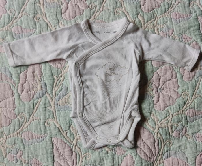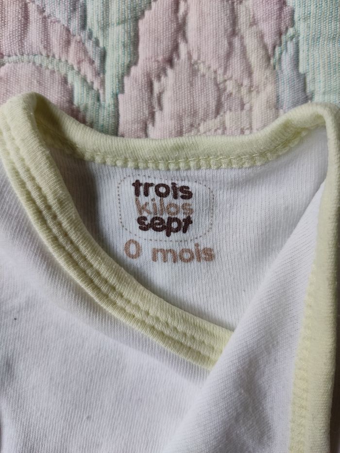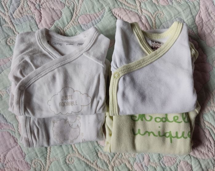 Lot de quatre bodies manches longues mixte. Deux de marque Gémo en très bon état, deux de marque Trois Kilos Sept, un en très bon état, l'autre en bon état. Taille : naissance, 0 mois.