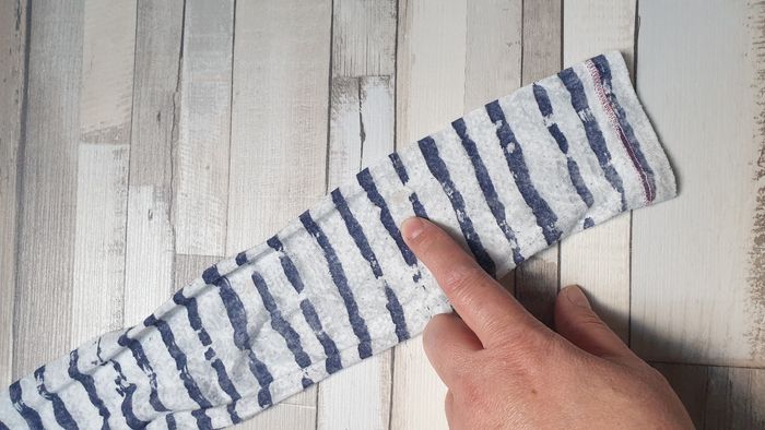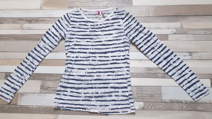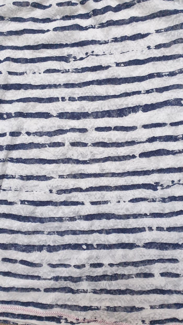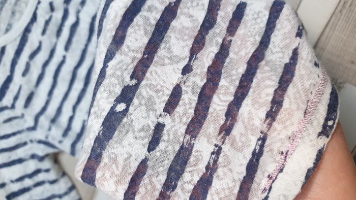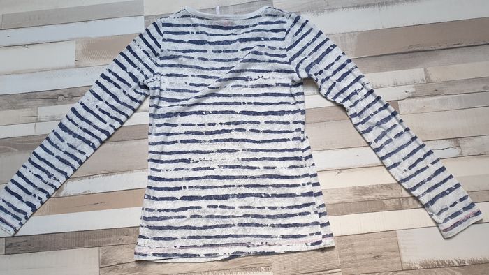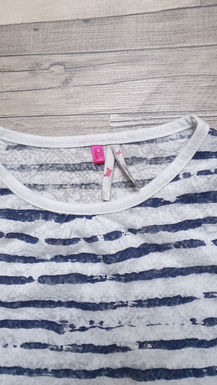 T-shirt rayé blanc et bleu. Tissu très fin, transparent Taille petit, noté 8ans mais je le classe en 6 - 7 ans Une tâche à l'arrière d'une manche
