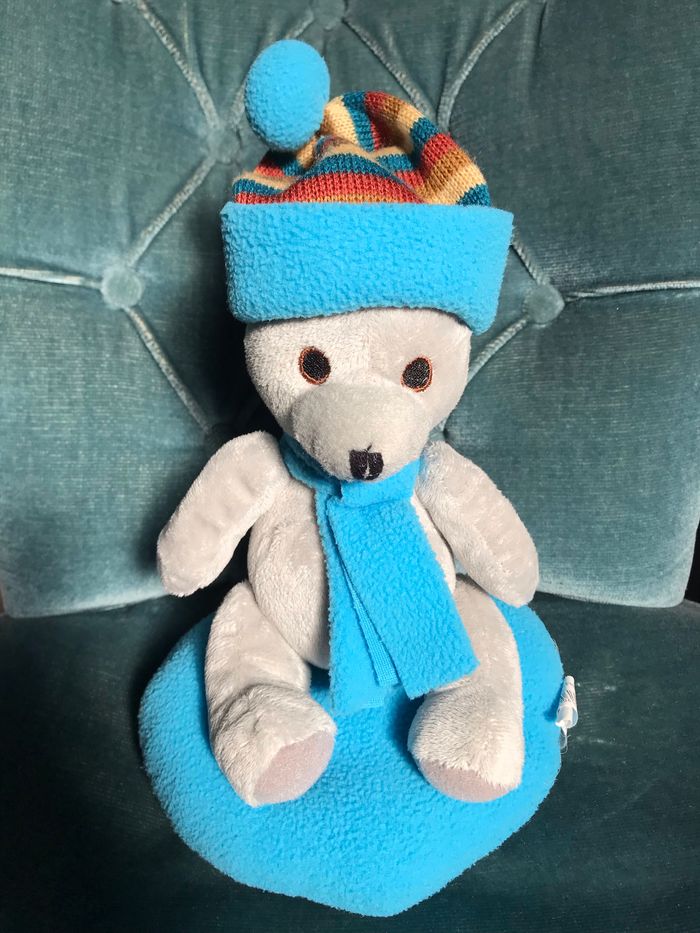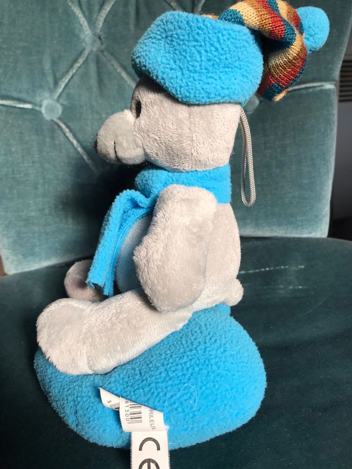 Ours gris avec bonnet et écharpe sur coussin polaire Environ 30 x 18 cm