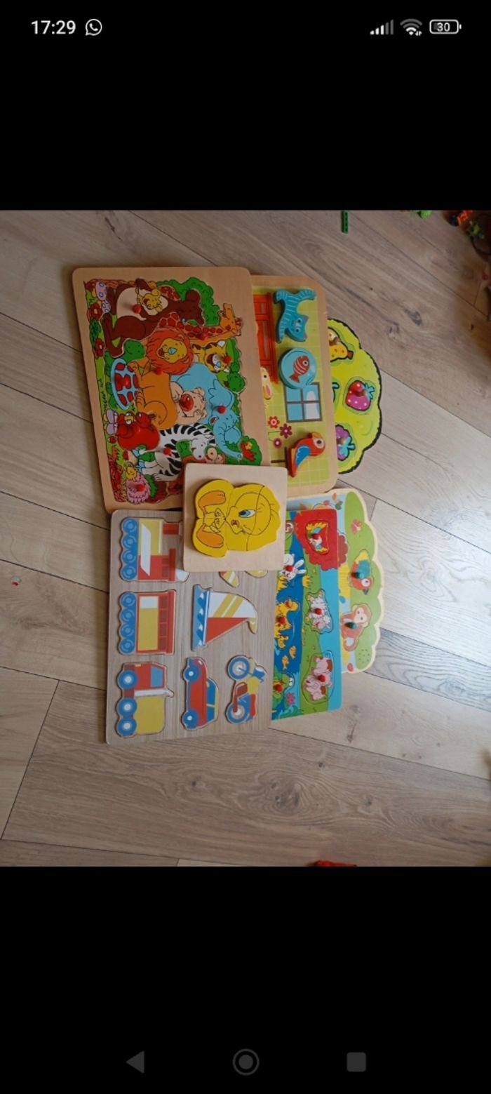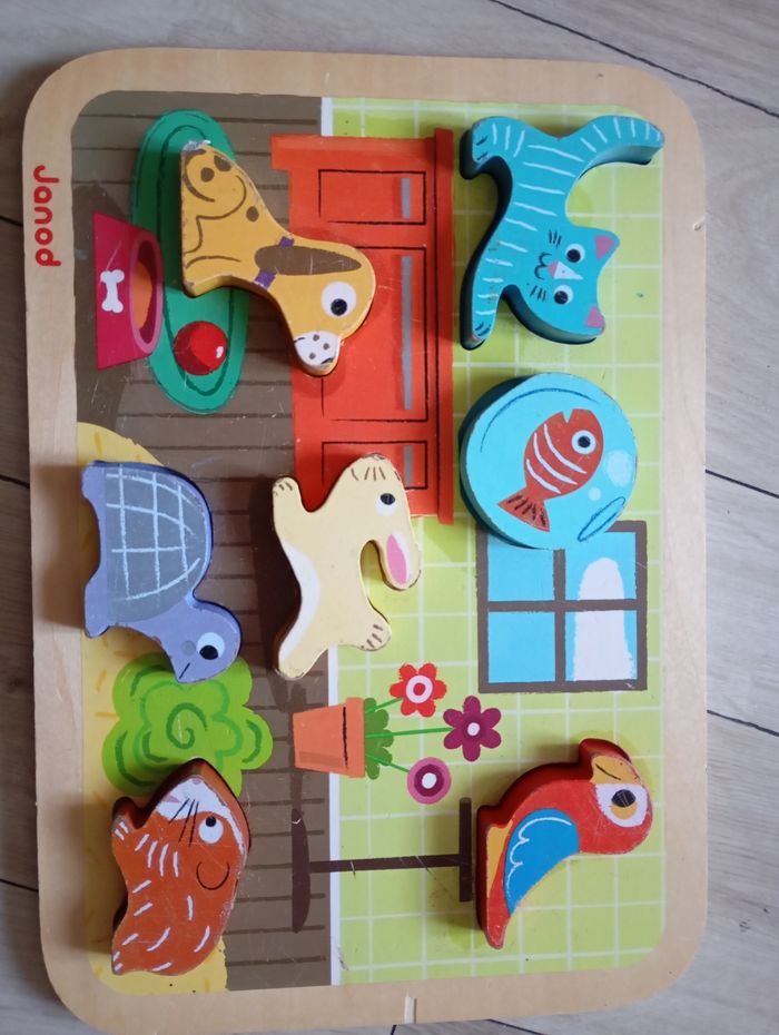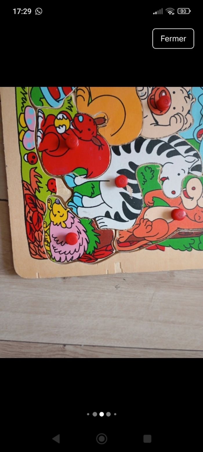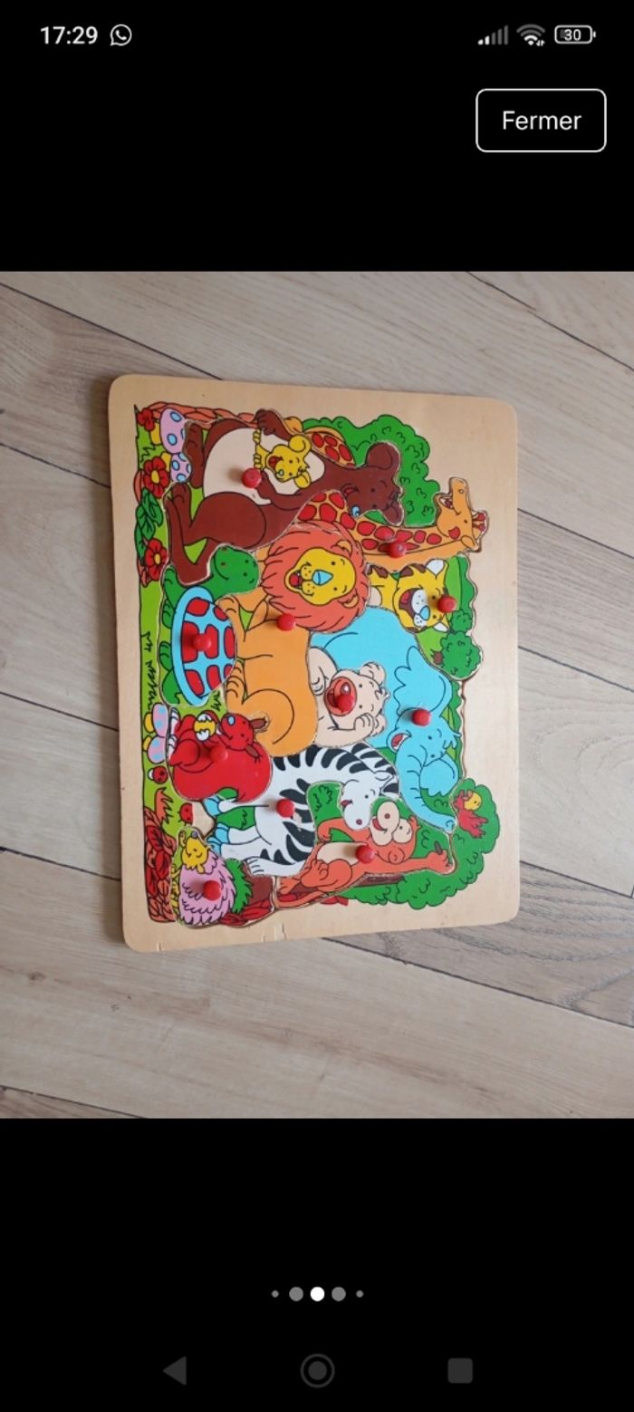 Lot de 7 puzzles en bois dont un qui émet des sons d animaux bon état dans l ensemble quelques traces d usure voir photos, et un où il y a des traces de crayons sous les pièces, et un au dos ce qui ne gêne pas l utilisation tout est sur les photos