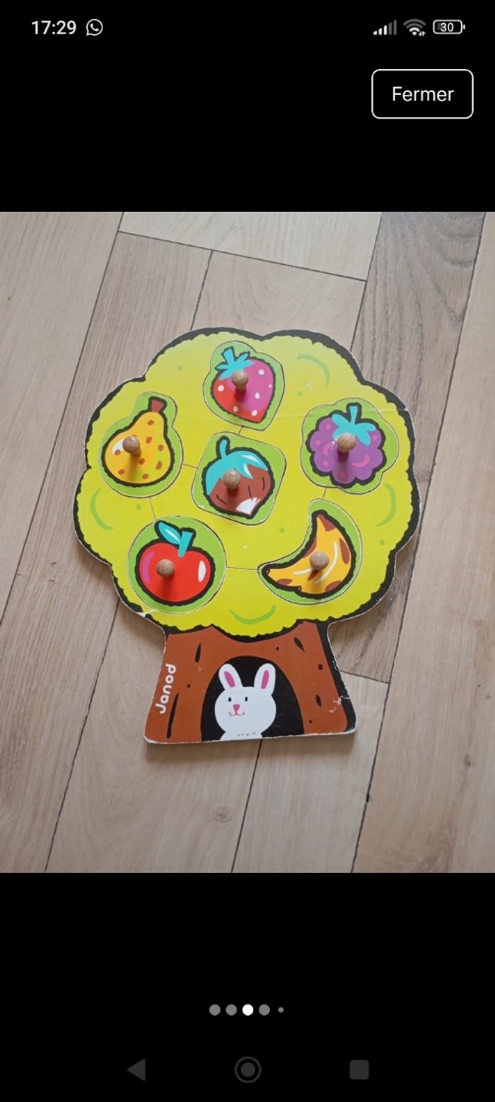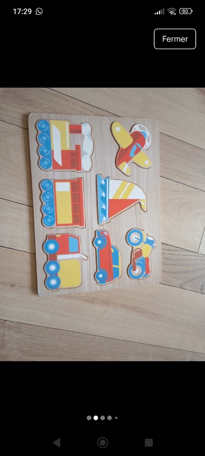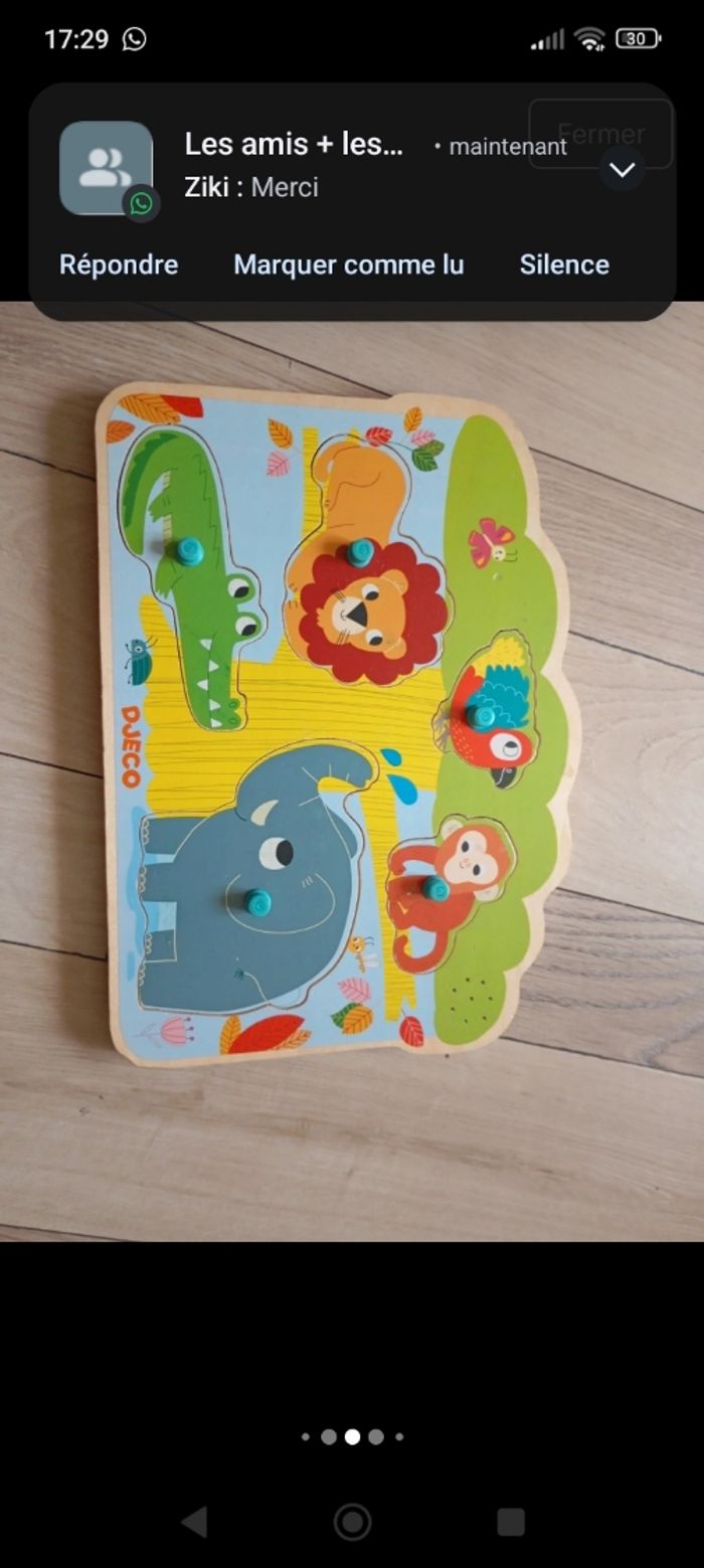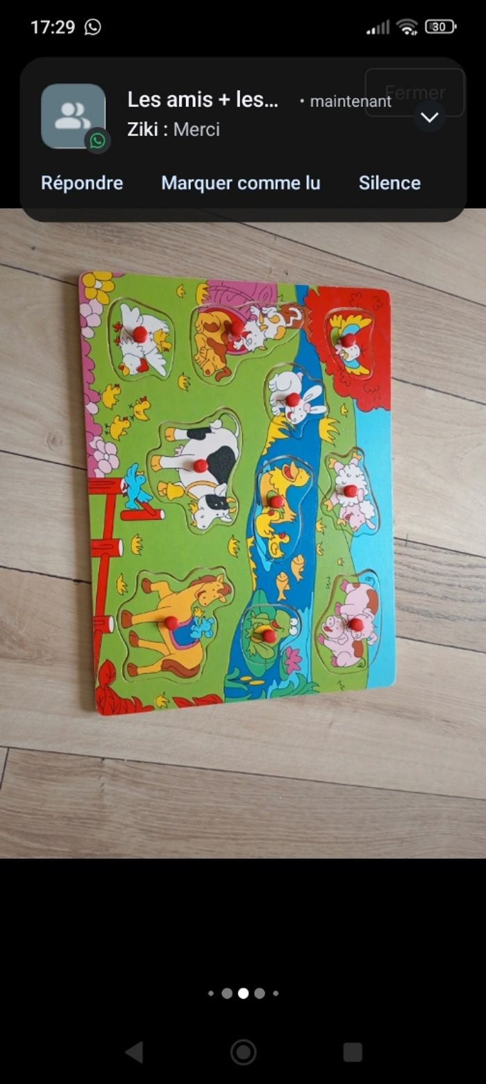 Lot de 7 puzzles en bois dont un qui émet des sons d animaux bon état dans l ensemble quelques traces d usure voir photos, et un où il y a des traces de crayons sous les pièces, et un au dos ce qui ne gêne pas l utilisation tout est sur les photos