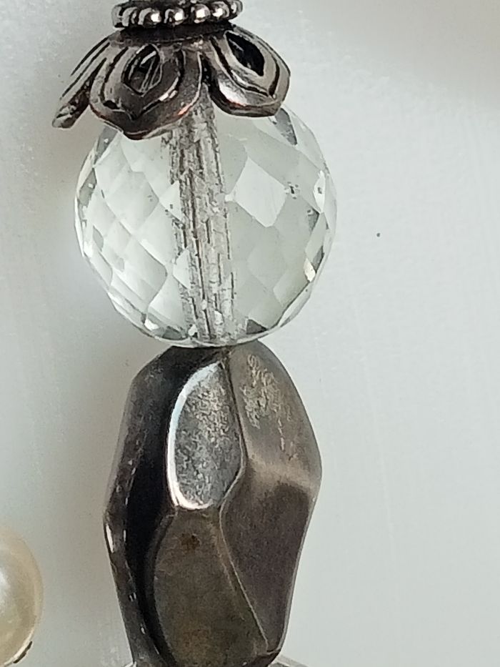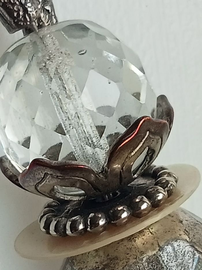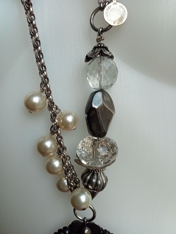 Magnifique sautoir de 200 gr, composé de grosses perles en céramique nacrees, de perles et d'anneau en cristal et nombreuses breloques, ainsi qu'un très beau médaillon de 6 cm de diamètre. Le tout en parfait état.