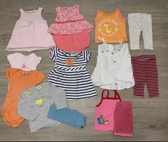 Lot de 12 pièces pour fille 6 mois ete - 2 bodies petit bateau - 3 robes - 1 Combishort DPAM - 3 leggings - 1 t-shirt manches longues - 1 pyjama 2 pièces J’offre -un petit débardeur orange avec une tache de décoloration -1 body petit bateau tache au col #fille6moisjoshana