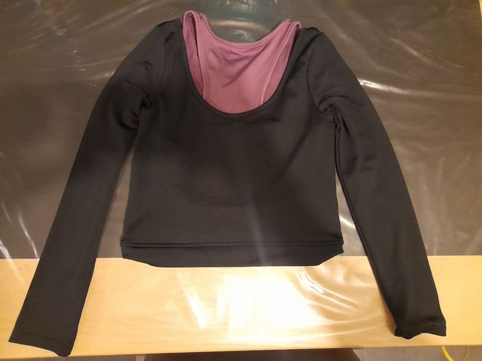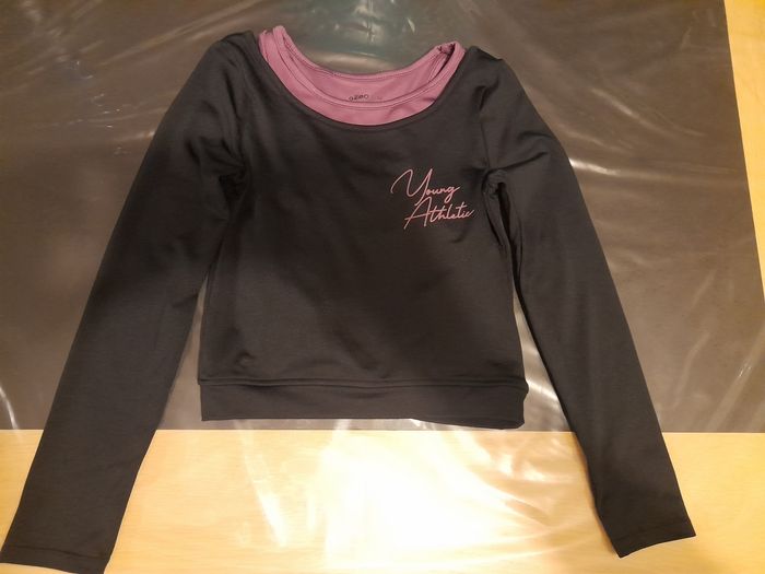 Joli tee-shirt de danse fille en 10ans de la marque gemo.en très bon état il est à 2 épaisseurs.celle intérieure est un débardeur violet et celle extérieure est noire et à manches longues.les 2 épaisseurs sont cousues ensemble sur le bas.