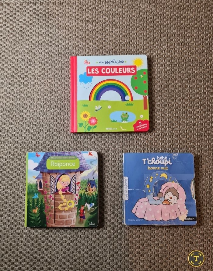 Lot de 3 livres animés à partir de 1 an 2 sont en état satisfaisant et 1 en très bon état. Voir les photos. - bébé t'choupi - bonne nuit : Nathan. - raiponce : Milan - mon animagier les couleurs : auzou éveil