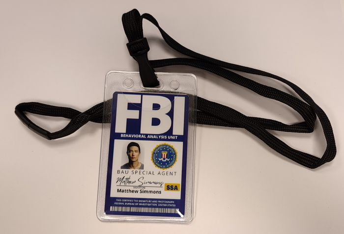 Badge de Matthew Simmons de la série Esprit Criminel. Taille : 8.6 / 5.4 cm Matière : PVC Recto