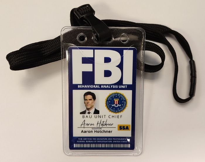 Badge de Aaron Hotchner de la série Esprit Criminel. Taille : 8.6 / 5.4 cm Matière : PVC Recto