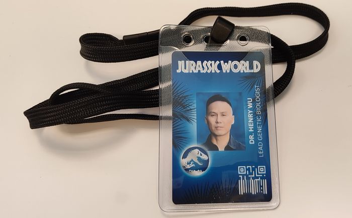 Badge du Dr Henry Wu du film Jurassic World. Taille : 8.6 / 5.4 cm Matière : PVC Recto