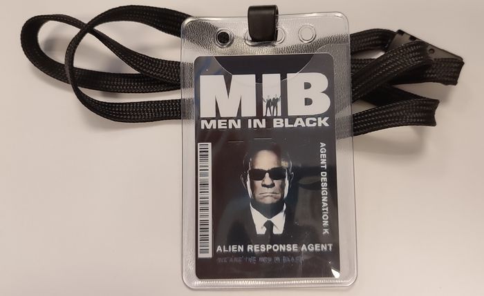 Badge de L'agent k du film Men in Black. Taille : 8.6 / 5.4 cm Matière : PVC Recto