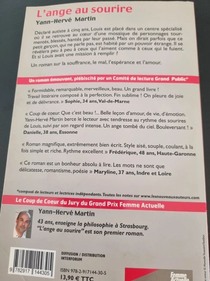 À vendre, le livre "L'Ange du Sourire" de Yann-Hervé Martin. Une œuvre touchante qui explore les thèmes de l'amour, de l'espoir et de la résilience. Pourquoi l'acheter ? Une lecture captivante pour ceux qui aiment les histoires inspirantes. Idéal pour les amateurs de littérature contemporaine. Un beau cadeau pour un ami ou un être cher !