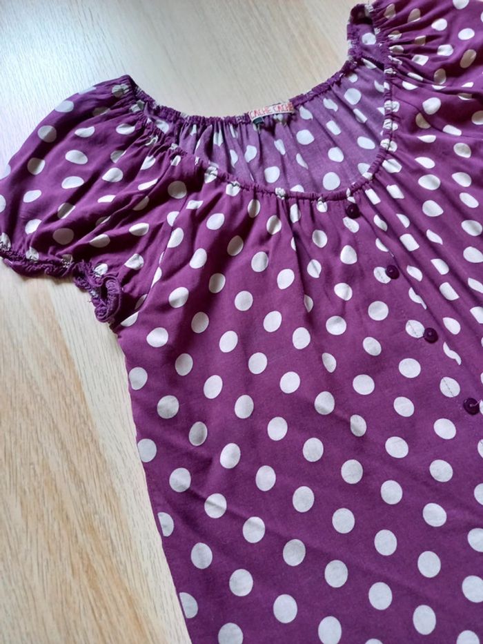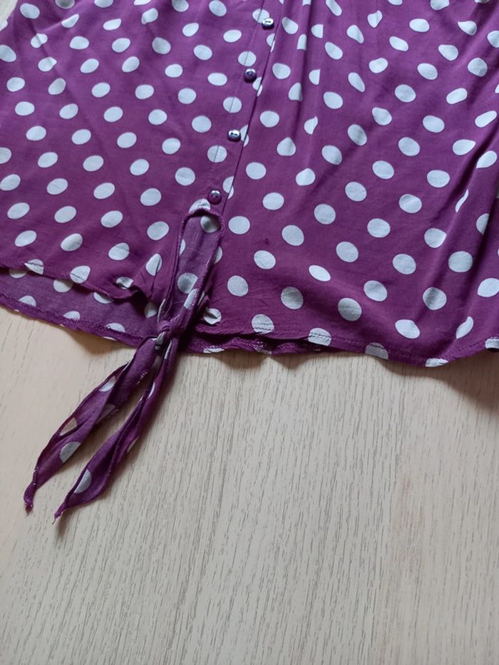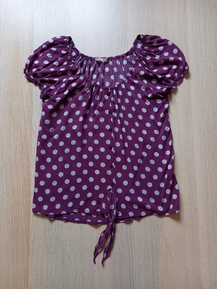 T-shirt avec nœud sur l'avant, très fluide. Excellent état excepté un tout petit accroc sur l'avant (le fil ressort mais il n'y a pas de trou). Taille 2