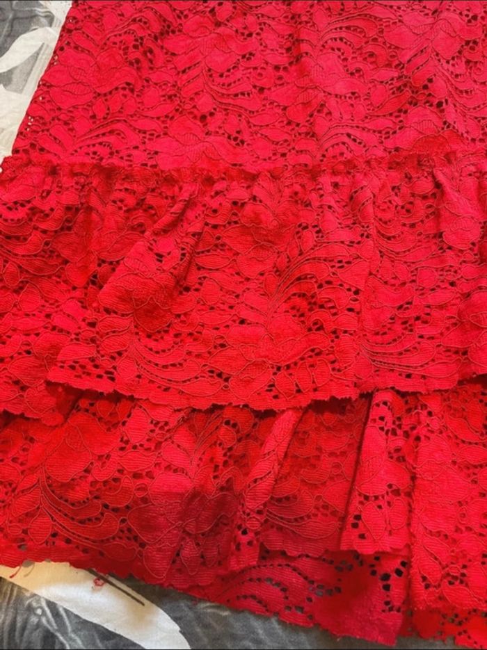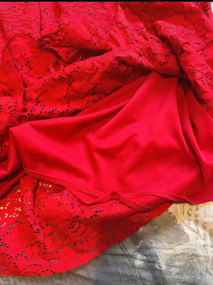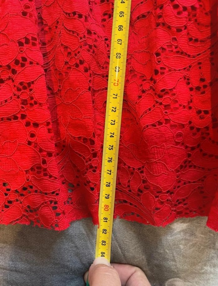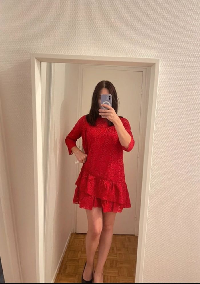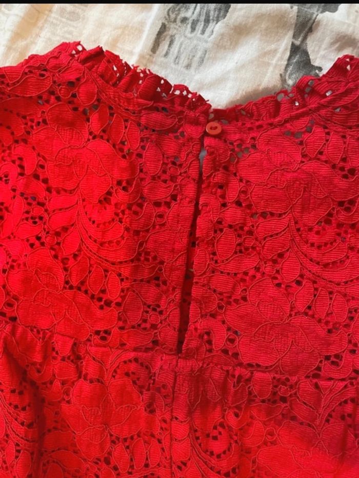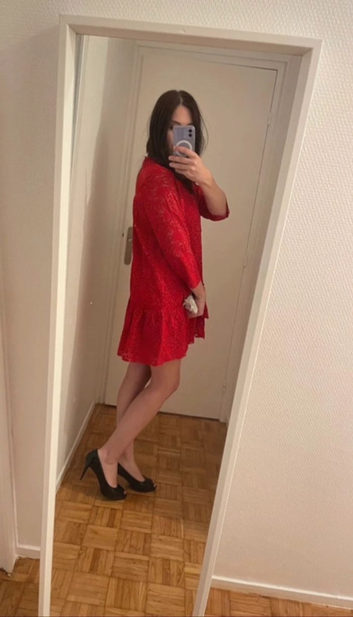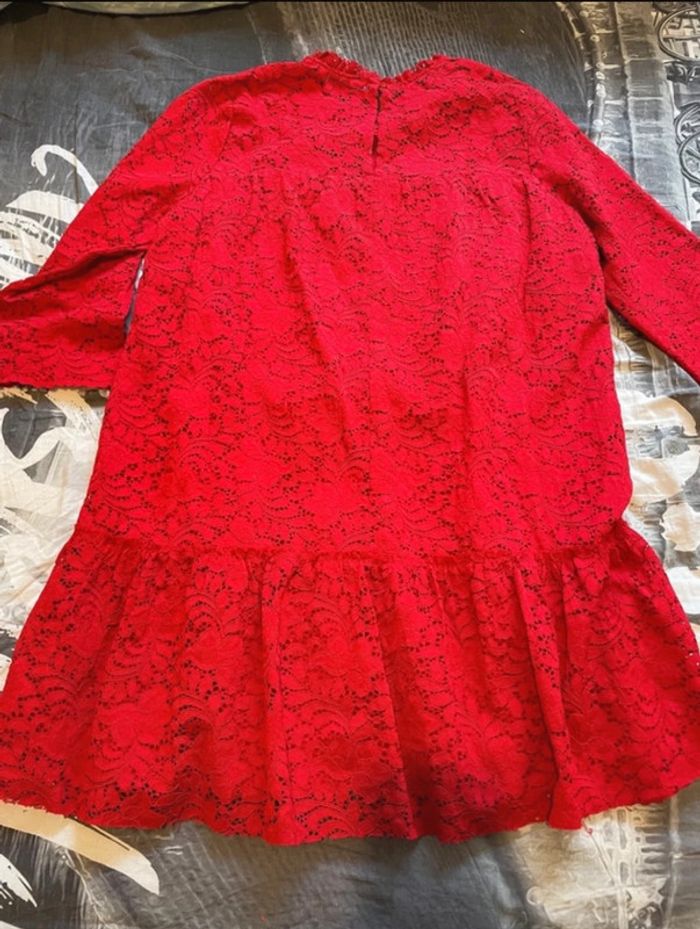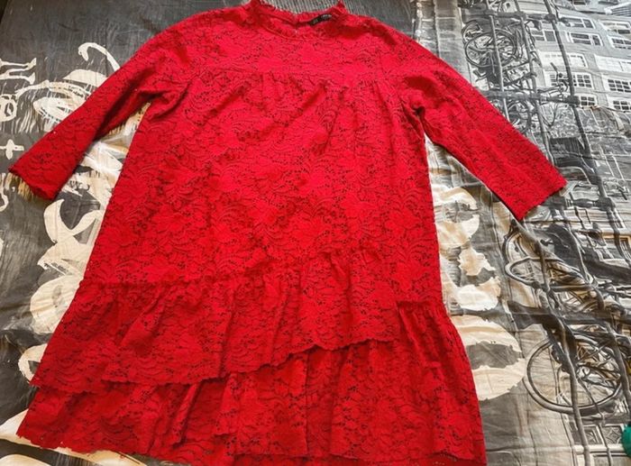 Robe rouge dentelle, manches 3/4 de la marque Zara Basic Taille M En parfait état Très agréable à porter Un peu large pour moi qui fait Du s