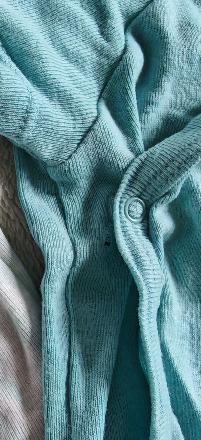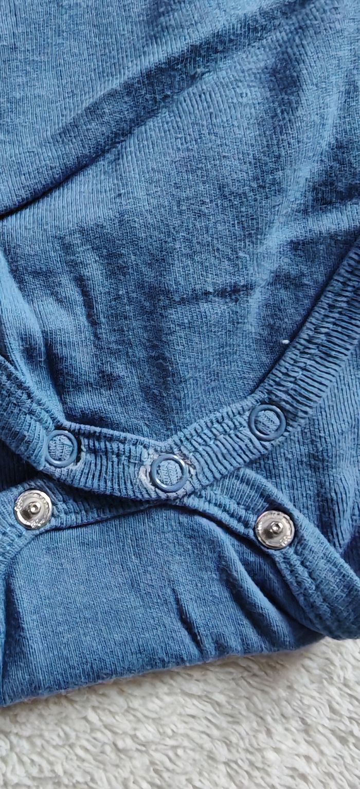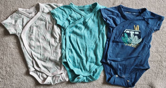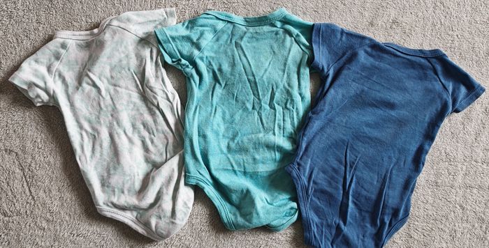 Lot de 3 bodys manches courtes : - un body blanc avec motif bleu clair - un body uni bleu turquoise - un body bleu foncé avec motif feuille et van Petit défaut : un petit trou sur le body turquoise et la couture d'un bouton du body bleu foncé commence un peu à se défaire Taille 6 mois Marque Gémo