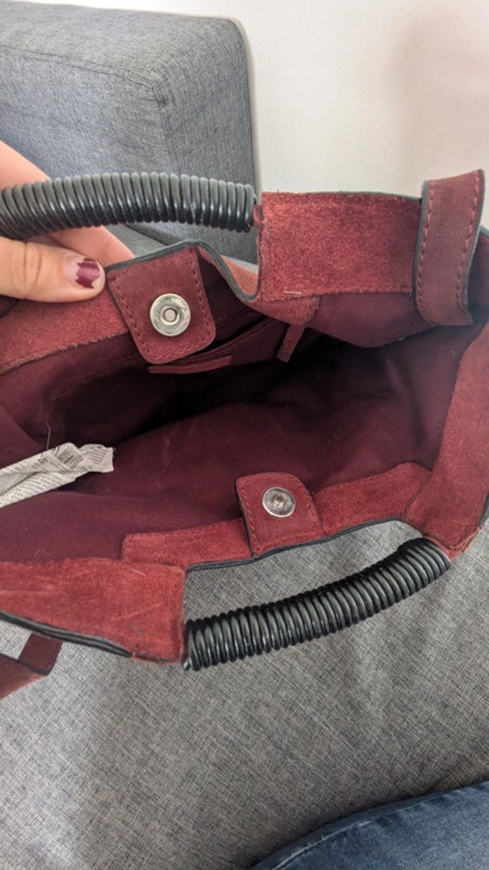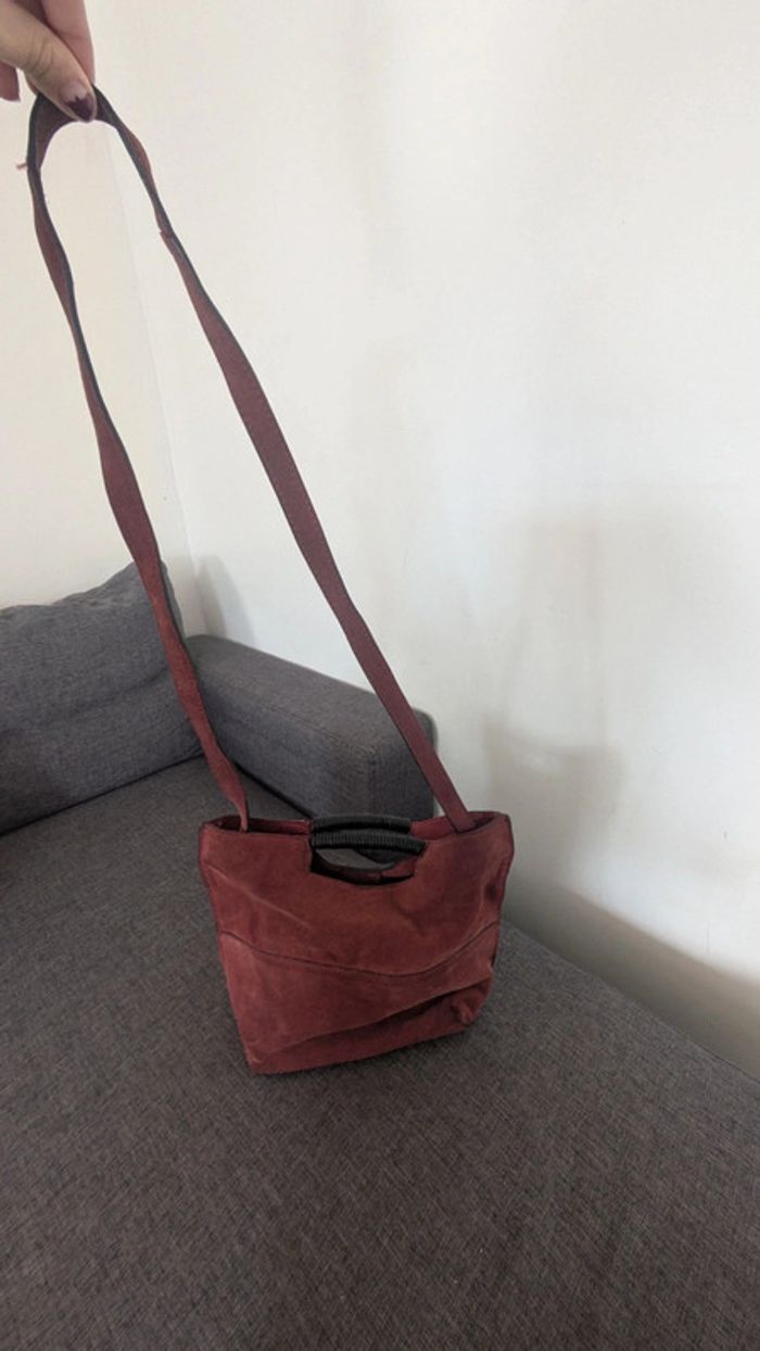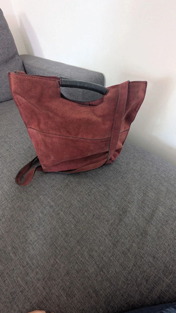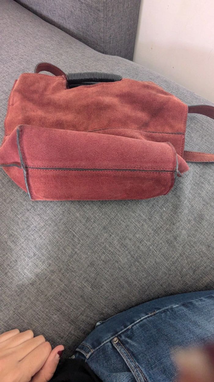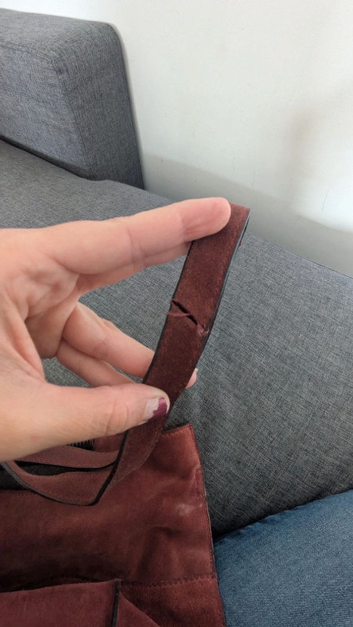 Sac à main porté main ou épaule en daim 34×27× 12 cm Bon état général Un défaut sur la lanière mais à l' intérieur (ne se voit pas porté). Voir dernière photo Prix en fonction de ce défaut.