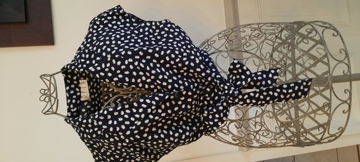 Portée mais très bien entretenue - Dimensions : aisselles 46 cm Bas : 36 cm , ce qui correspond aux épaules, pas possibilités de mesurer épaules car pas de couture Longueur : Dos (à partir bas col) 40 cm Devant : 34 cm 3 boutons Se noue avec ceinture ,même tissu, intégrée Tissu hyper agréable, je pense jersey de viscose (mais plus lisible sur étiquette)