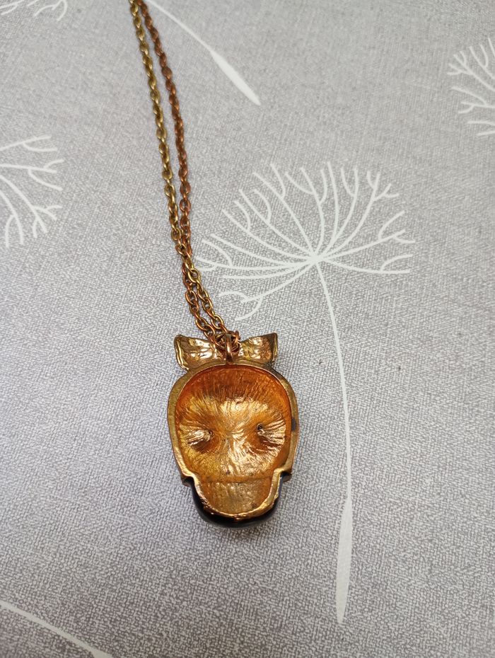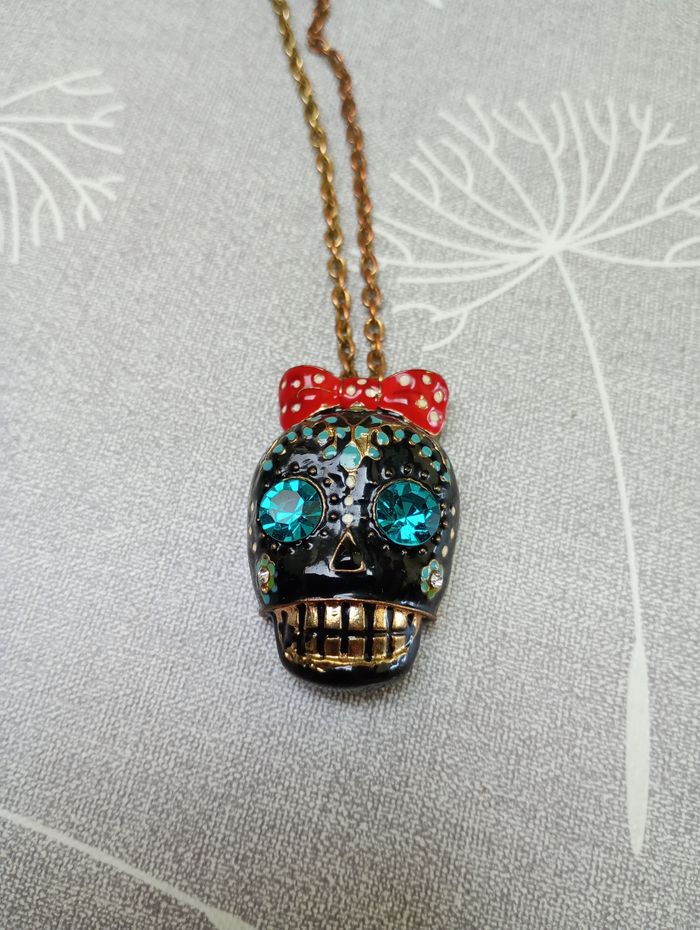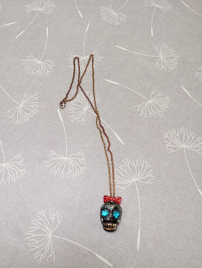 Collier avec pendentif en forme de crâne mexicain. Longueur : 39 cm. Pendentif : 4 cm. Marque : Betsey Johnson. Très bon état.