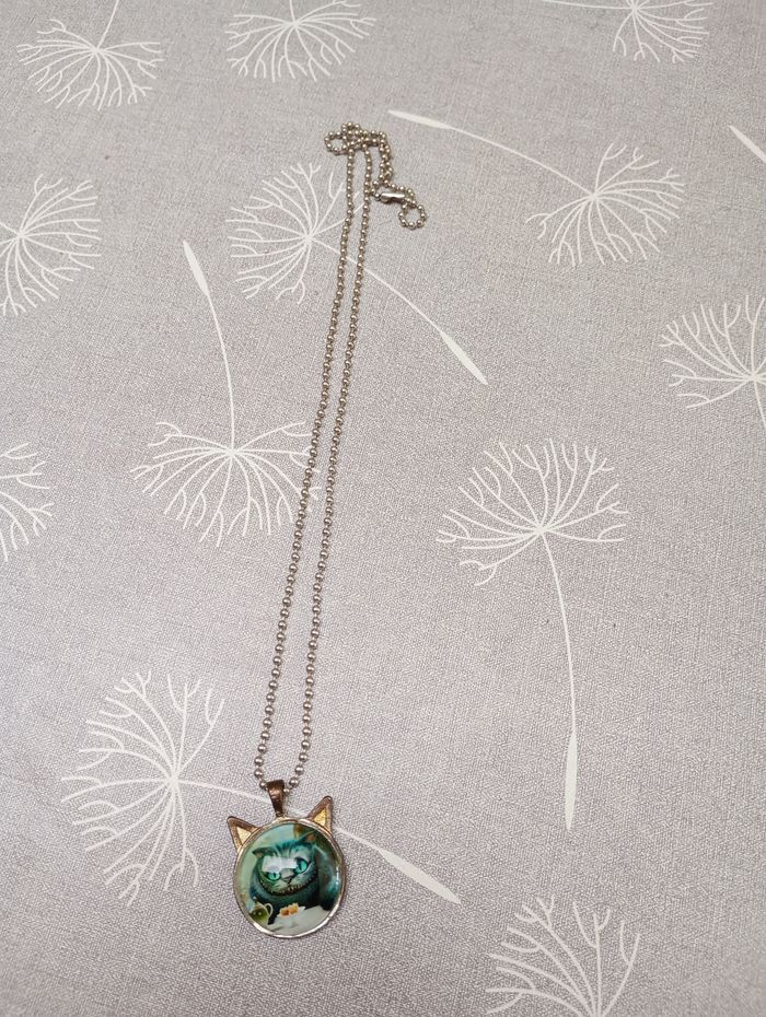 Collier avec cabochon en forme de chat et image du chat de Cheshire dans le film d'Alice au pays des merveilles. Longueur : 33 cm. Pendentif : 4 cm. Très bon état.